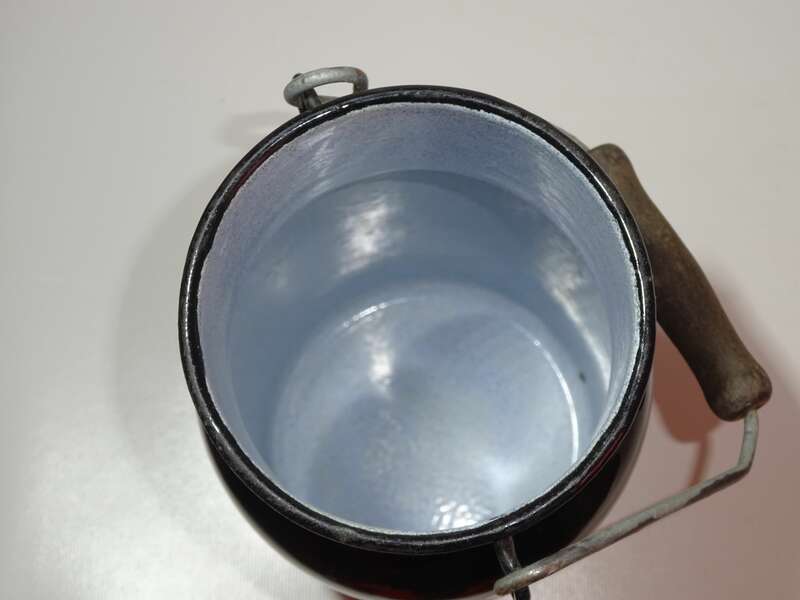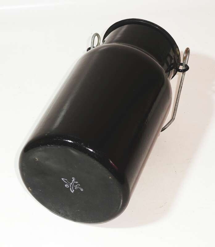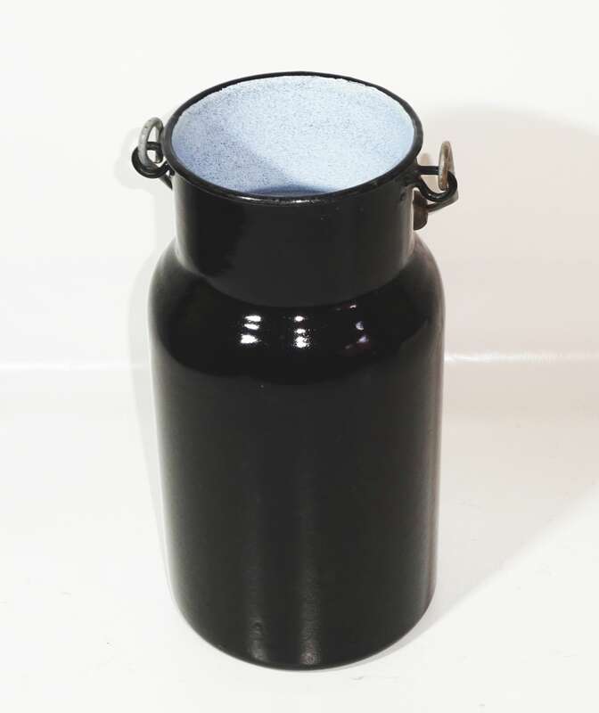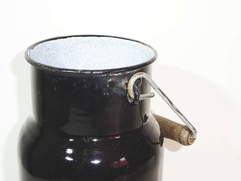 Alte Emaille Kanne Behälter Schwarz mit Henkel Gartendeko Vintage Pflanzgefäß