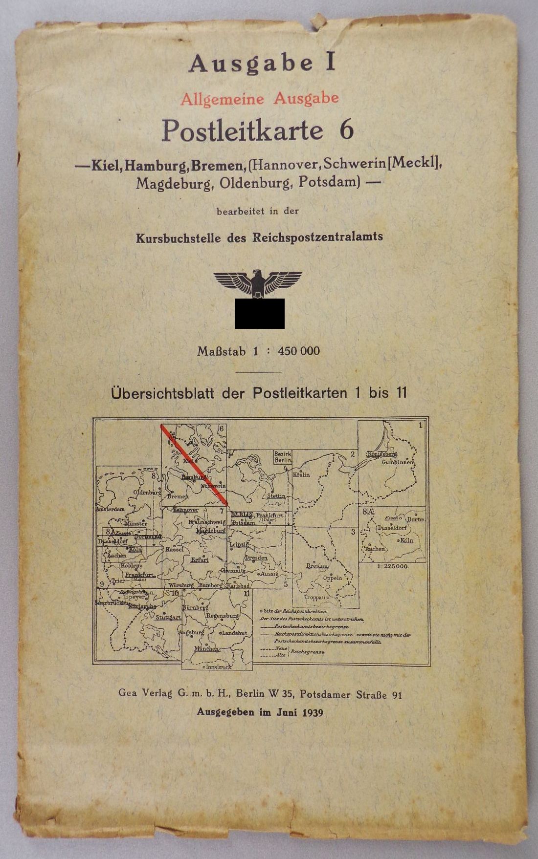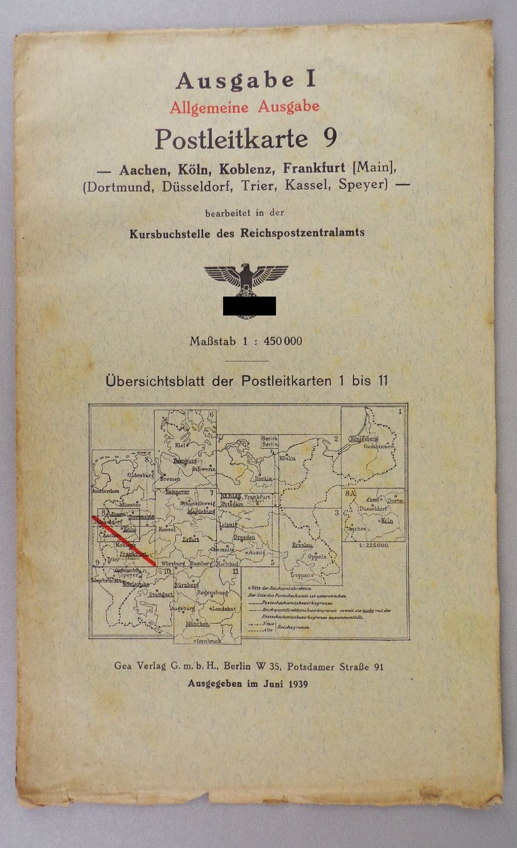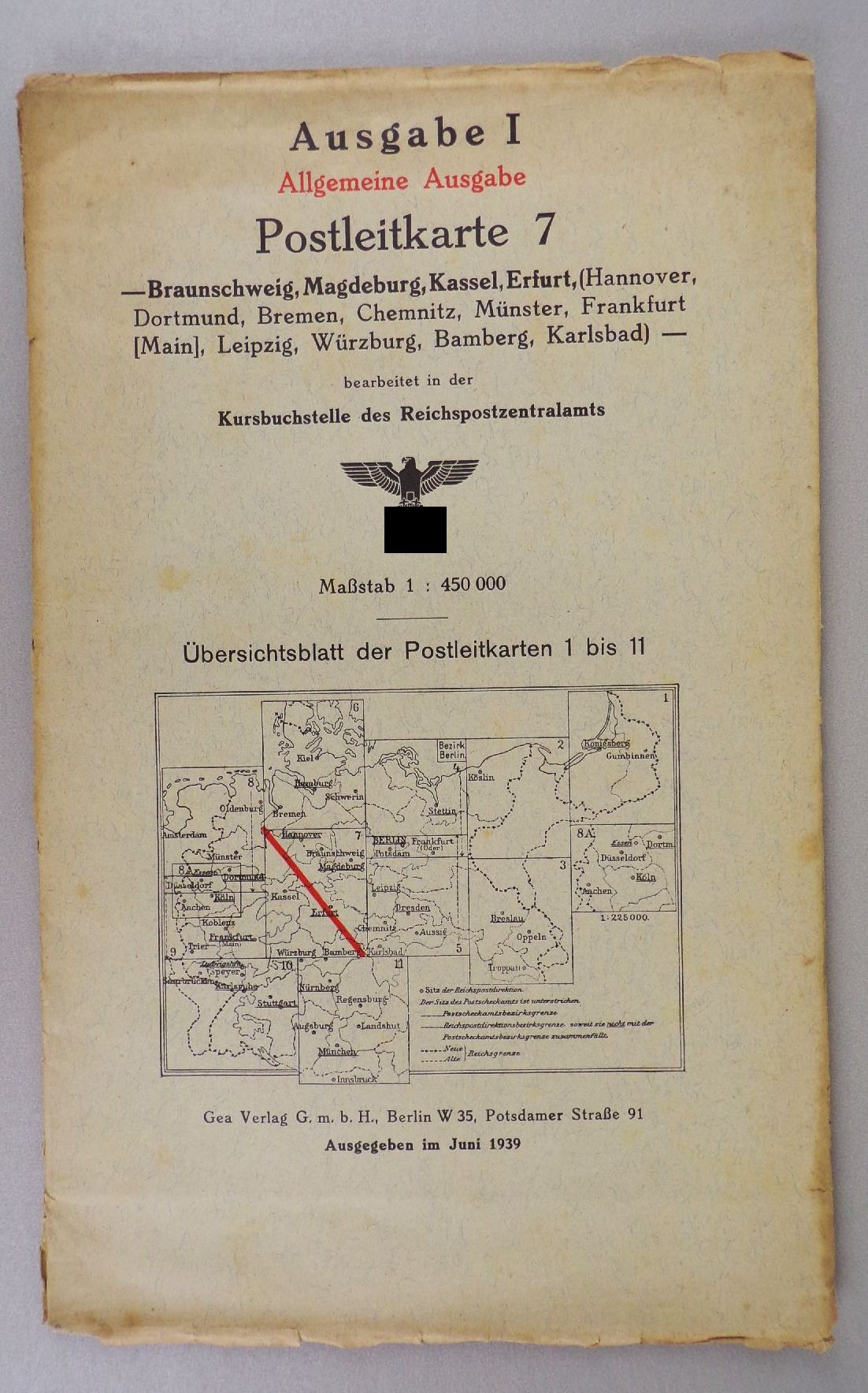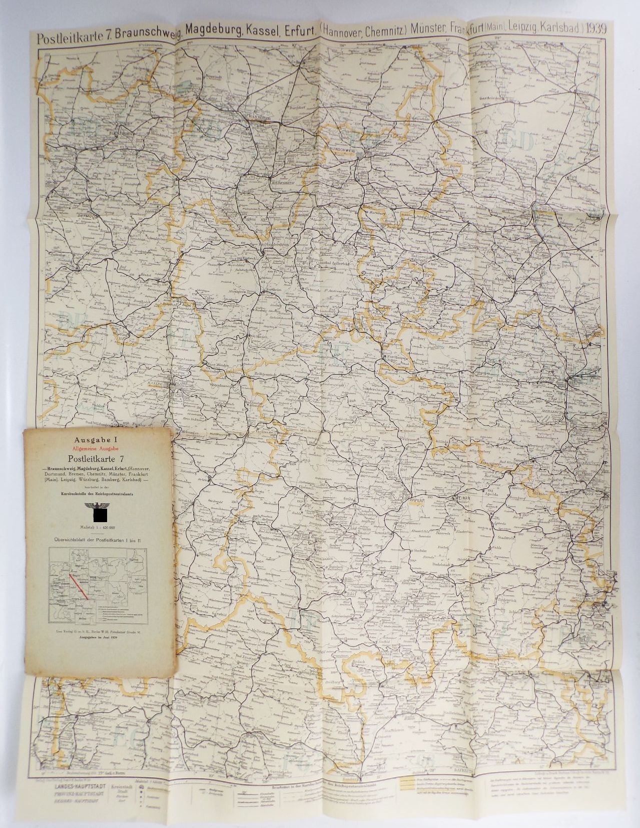 7 originale, alte Landkarten, 1939. Darunter Kiel, Hamburg, Bremen / Braunschweig, Magdeburg, Kassel, Erfurt / Oldenburg, Münster, Düsseldorf / Aachen, Köln, Koblenz, Frankfurt / Karlsruhe, Saarbrücken, Speyer, Stuttgart / Köslin / Stettin, Potsdam, Berlin. Maßstab jeweils 1 : 450.000. Maße der Karten variieren leicht. Erhaltung: Titel leicht fleckig, Karten mit vereinzelte Einrissen, bestoßen, alles weitere siehe bitte Fotos. Wird nur komplett angeboten.