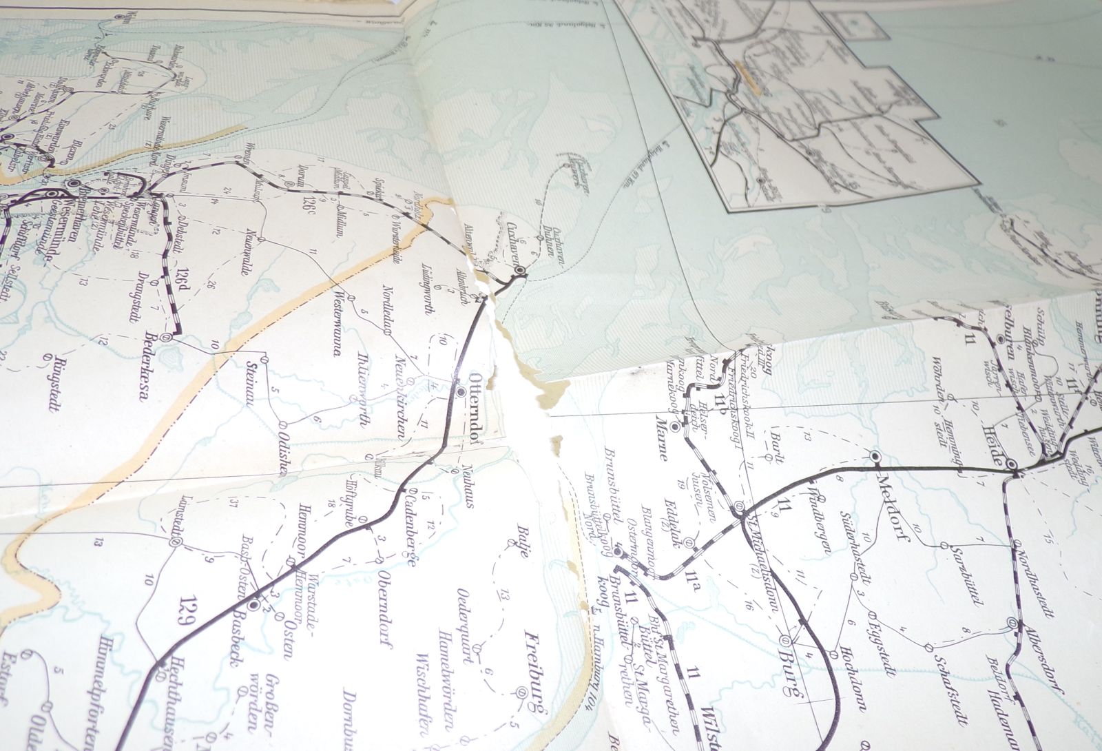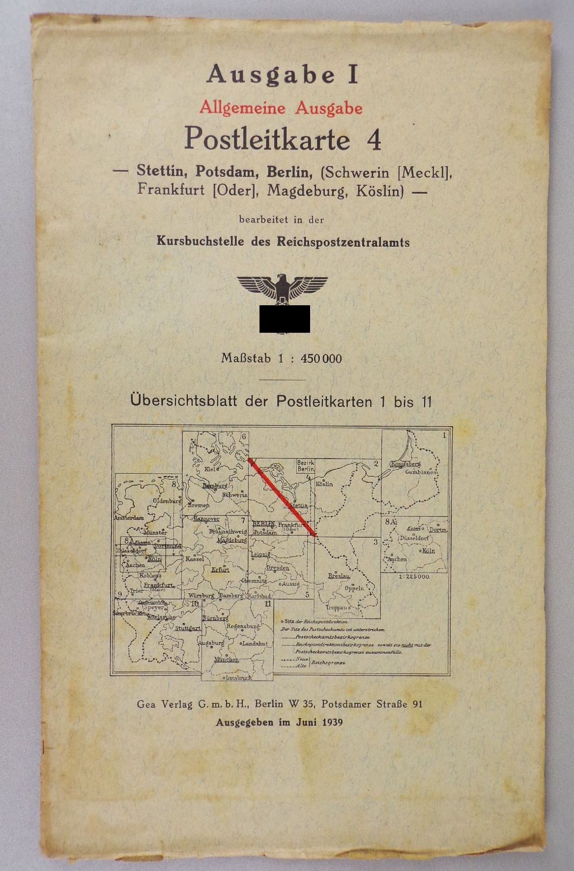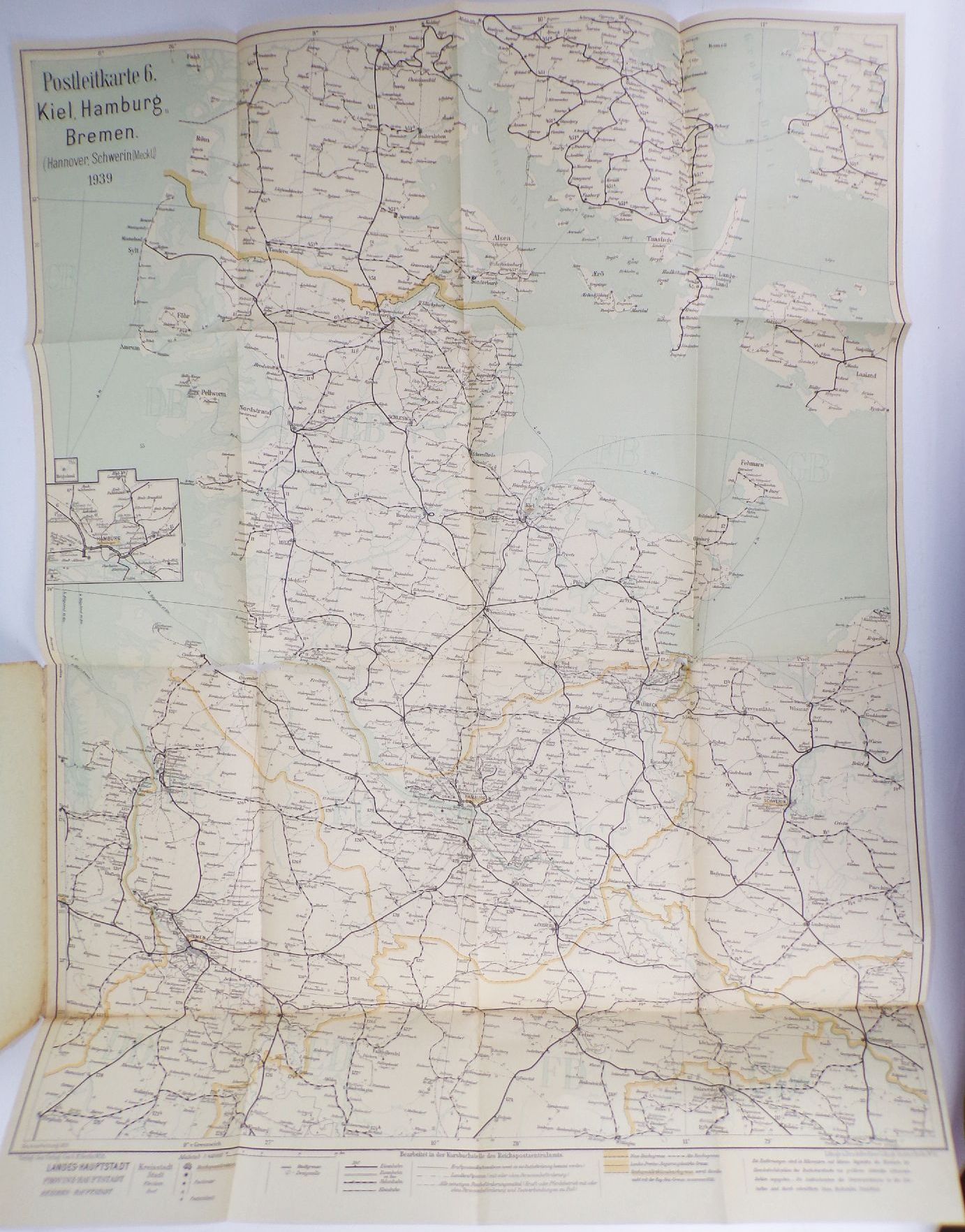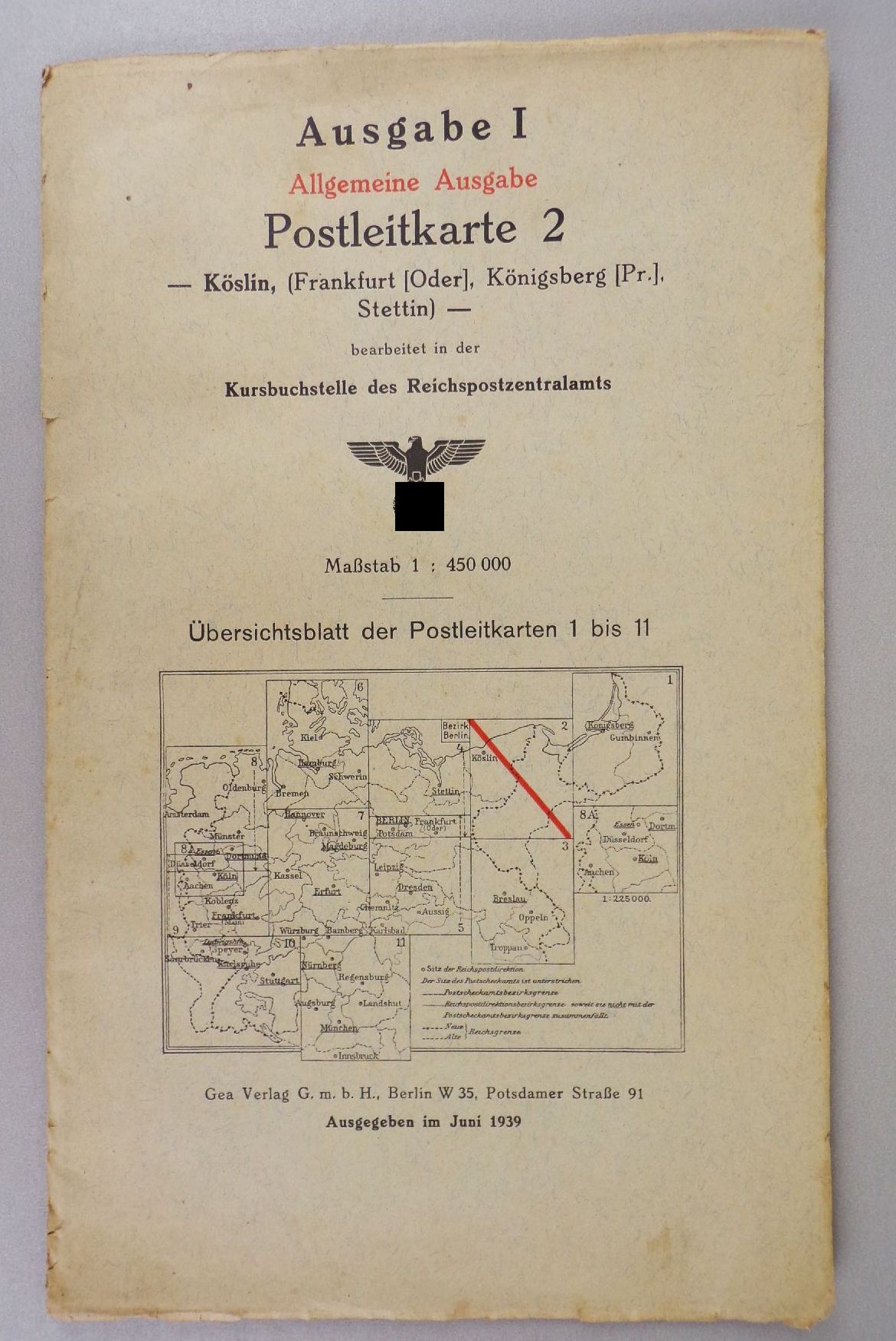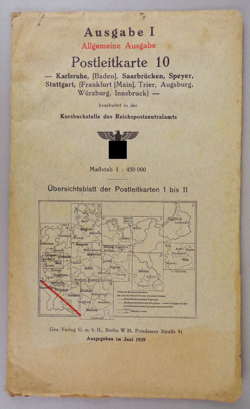 7 originale, alte Landkarten, 1939. Darunter Kiel, Hamburg, Bremen / Braunschweig, Magdeburg, Kassel, Erfurt / Oldenburg, Münster, Düsseldorf / Aachen, Köln, Koblenz, Frankfurt / Karlsruhe, Saarbrücken, Speyer, Stuttgart / Köslin / Stettin, Potsdam, Berlin. Maßstab jeweils 1 : 450.000. Maße der Karten variieren leicht. Erhaltung: Titel leicht fleckig, Karten mit vereinzelte Einrissen, bestoßen, alles weitere siehe bitte Fotos. Wird nur komplett angeboten.
