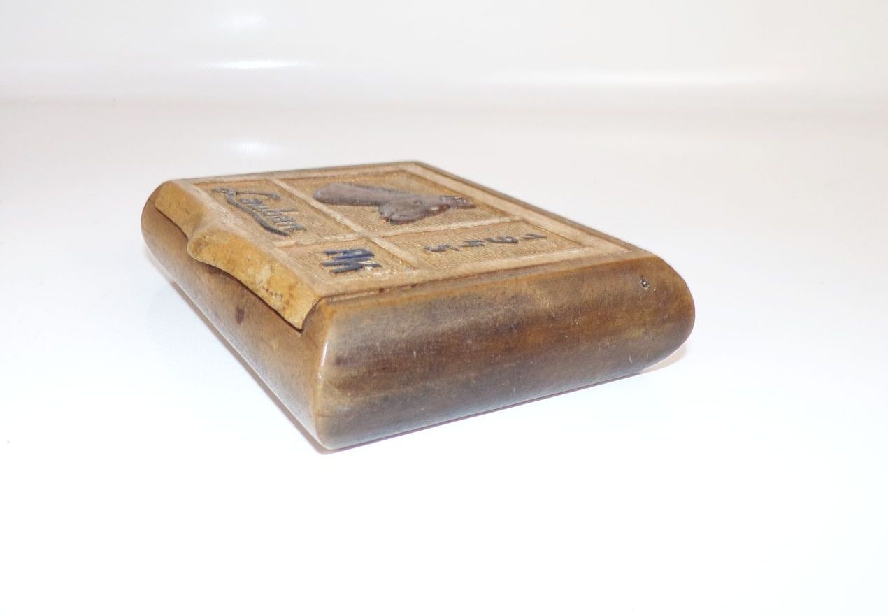 Originale, handgeschnitzte Box, 1945. Lauban ( Schlesien ). Maße: 10 cm x 8 cm x 2,5 cm. Erhaltung: gebrauchter, guter Zustand, alles weitere siehe bitte Fotos. Es wird keine Mehrwertsteuer ausgewiesen, da wir der Differenzbesteuerung nach § 25a UStG unterliegen.