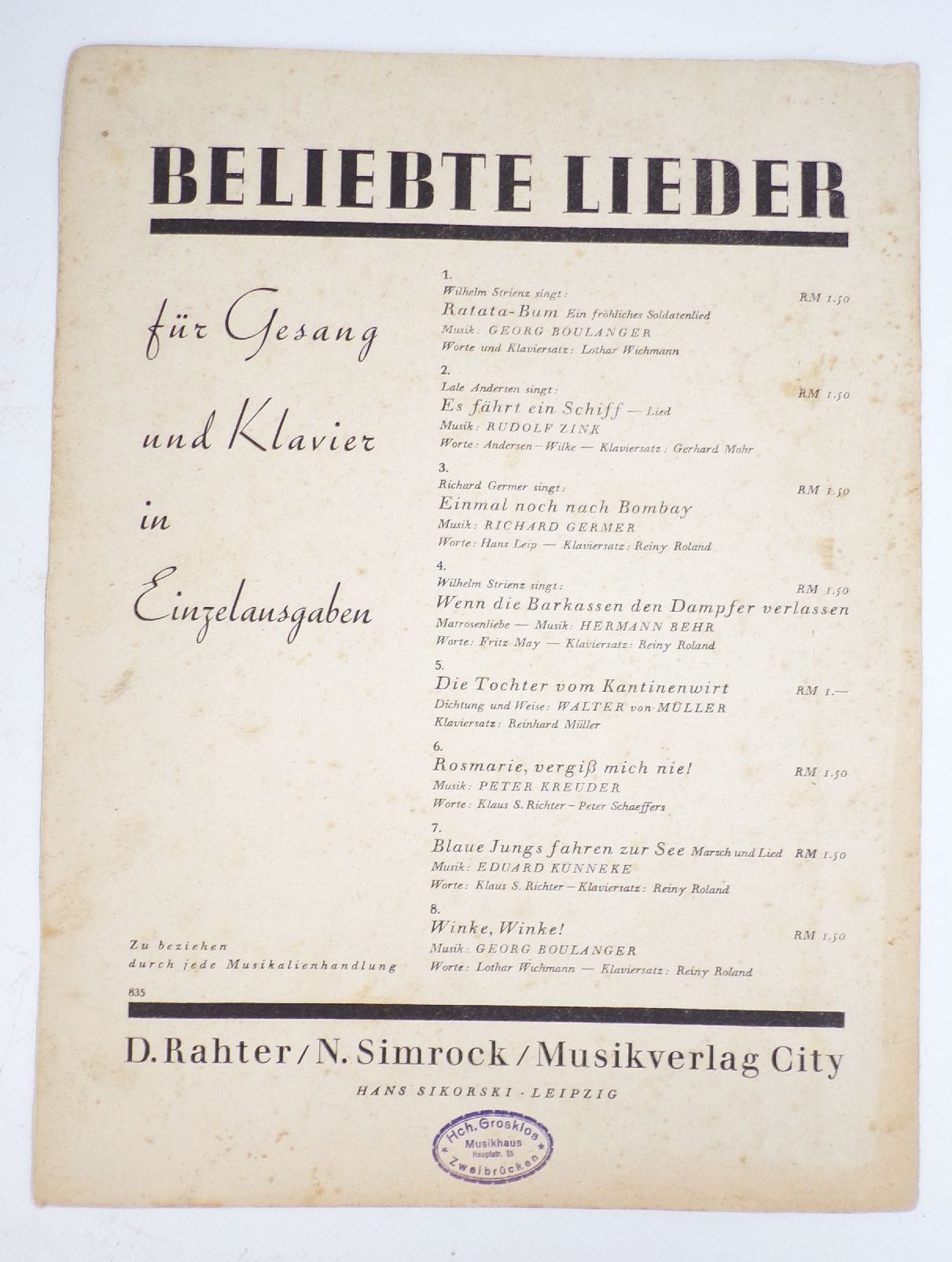 Originale Broschur, Format: 23,5 cm x 32 cm, Noten. 11 Seiten. Erhaltung: außen leicht unsauber, Heftrücken leicht eingerissen, ansonsten gut, alles weitere siehe bitte Fotos. Es wird keine Mehrwertsteuer ausgewiesen, da wir der Differenzbesteuerung nach § 25a UStG unterliegen.