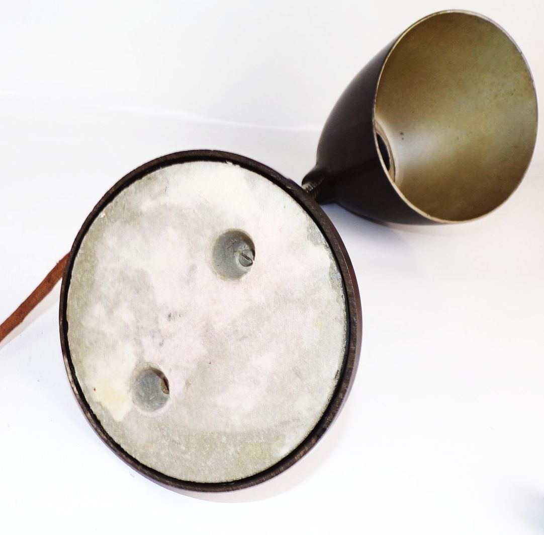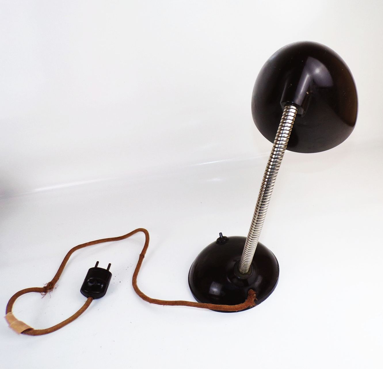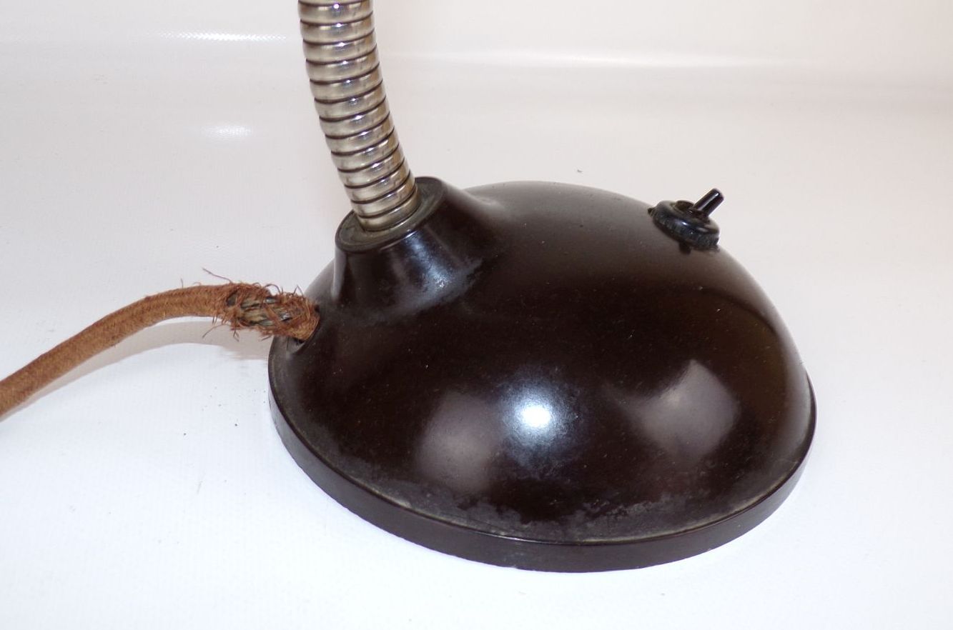 Originale, alte Schreibtischlampe, ca. um 1950. Mit einen Lampenschirm und Lampenfuß aus Bakelit, in der Farbe dunkelbraun - fast schwarz. Der verstellbare Gelenkarm ist aus Metall. Größe max.: 38 cm, Durchmesser Lampenschirm Öffnung: 15,5 cm. Mit einer E27 Lampenfassung ( max. 40 Watt ) . Nicht funktionsfähig, da das Kabel defekt ist. Erhaltung: Elektrik muss erneuert werden, Gelenk ( Arm / Lampenfuß ) hat in einigen Einstellungen etwas spiel, ansonsten befindet sich die Lampe in einen guten, gebrauchten Zustand. Siehe bitte auch Fotos.