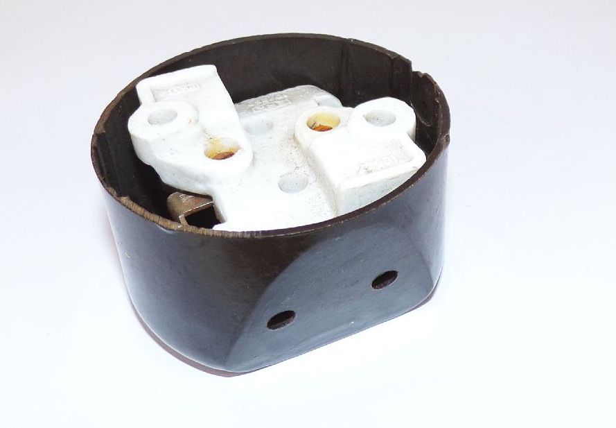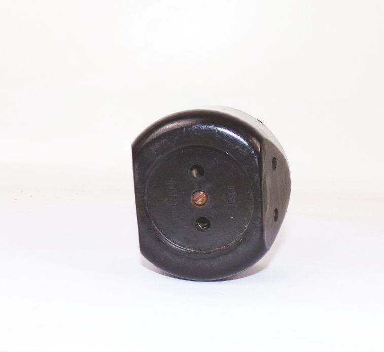 Originale, alte Steckdose bzw. Verteilerdose. Mit insgesamt 3 Anschlüssen. Aufputz, Durchmesser: 6,2 cm, Höhe: 4 cm. Muss ggf. aufgearbeitet werden, um den heutigen Stand der Technik zu erfüllen. Erhaltung: am Rand mit einen minimalen Chip, ansonsten gebrauchter, guter Zustand, alles weitere siehe bitte Fotos.