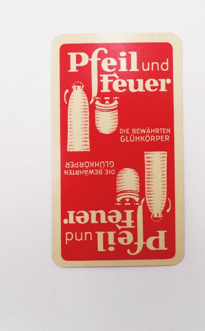 Originales, vollständiges Reklame Kartenspiel. Pfeil und Feuer Glühkörper Berlin. 32 Blatt. Vollständig. Erhaltung: Schachtel bestoßen und unsauber, Karten von gut bis sehr erhalten. Alles weitere siehe bitte Fotos. Es wird keine Mehrwertsteuer ausgewiesen, da wir der Differenzbesteuerung nach § 25a UStG unterliegen.