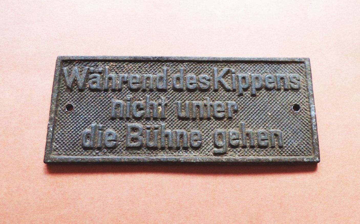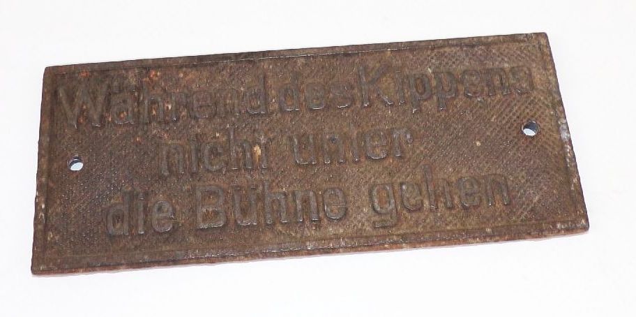 Altes Metall Schild Während des Kippens nicht unter die Bühne gehen Warnschild