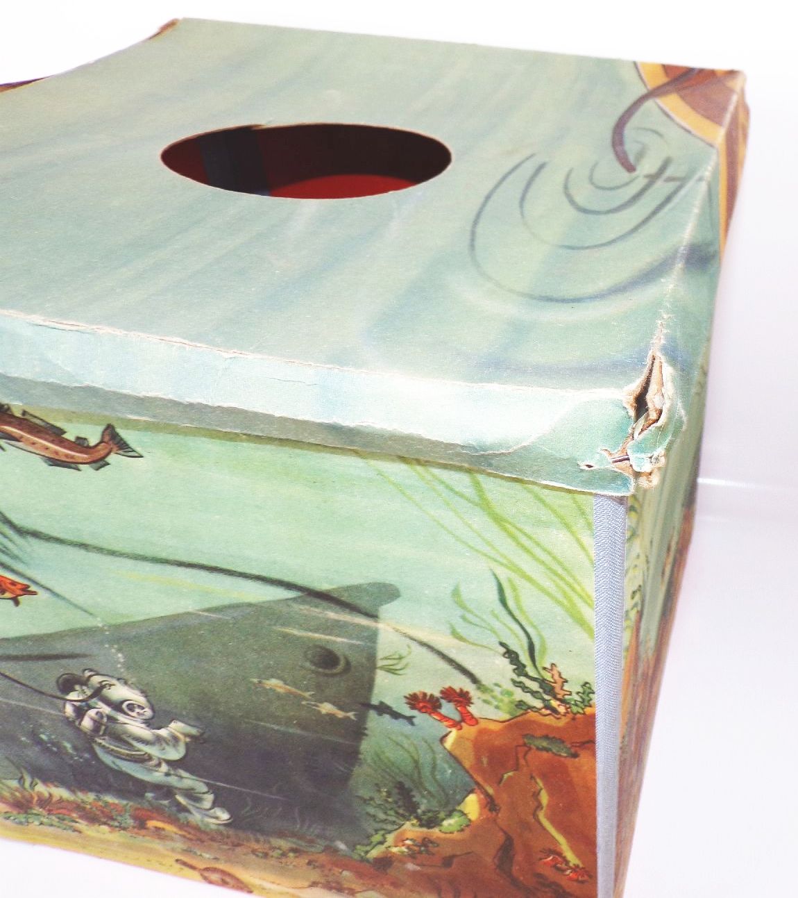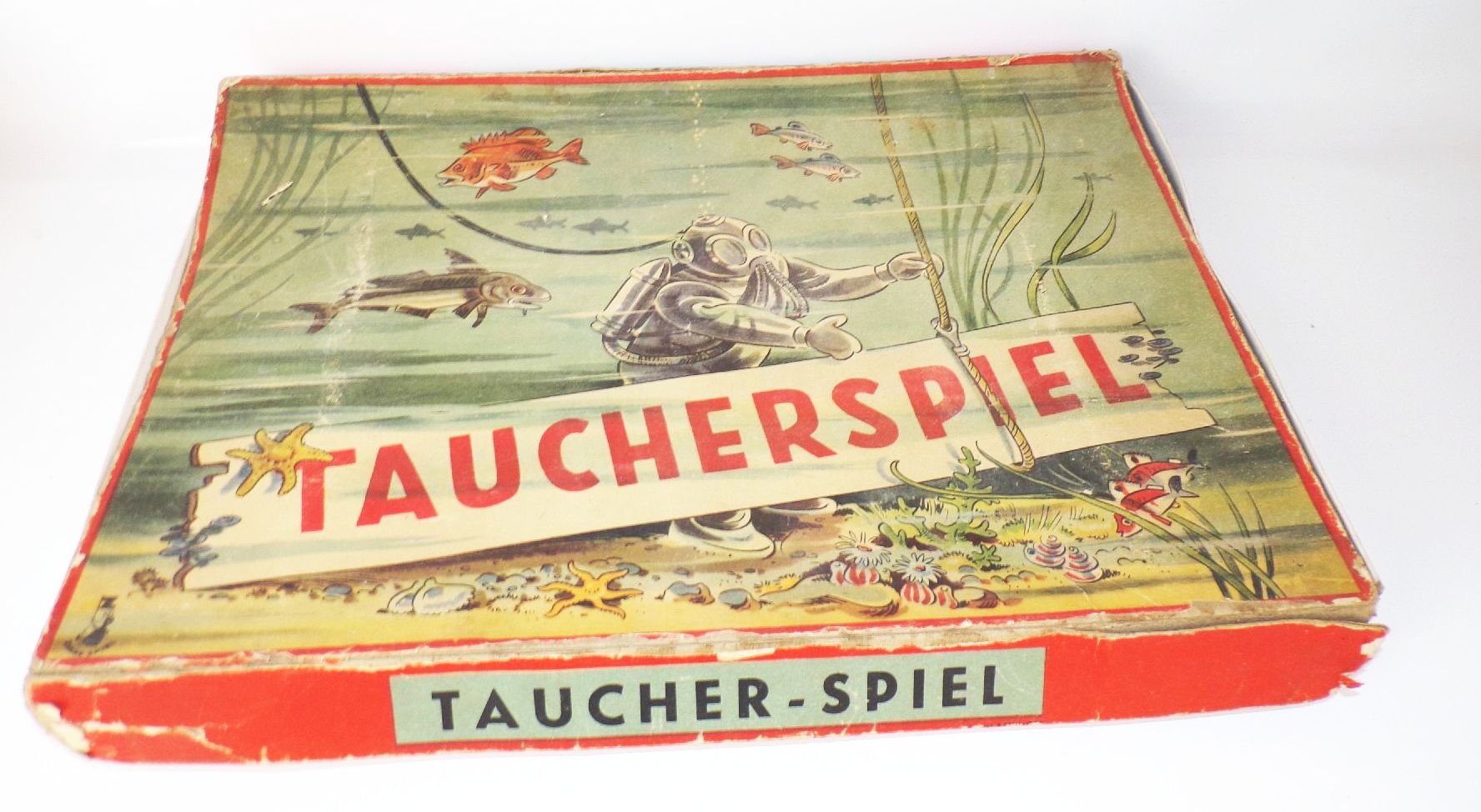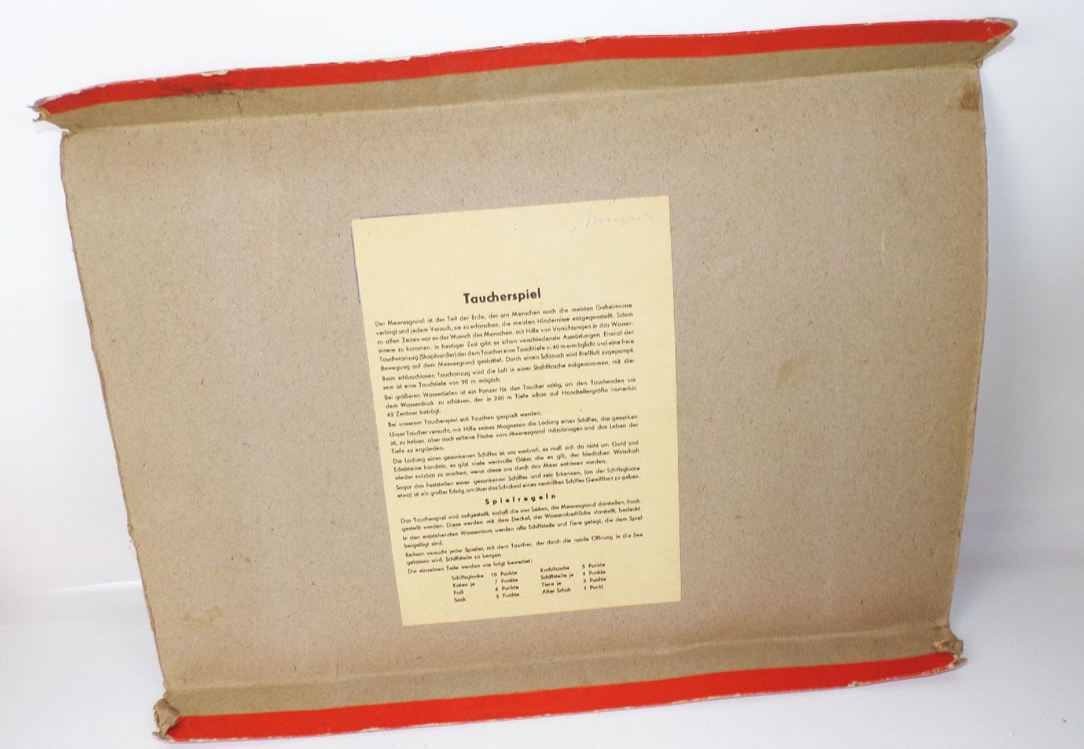 Originales, altes Taucherspiel, ca. um 1950. Maße der Schachtel: 26 x 38,5 x 4 cm. Mit einen Taucher, 3 Gegenständen, Diorama, und der Spielanleitung, welche sich im Inneren des Deckels befindet. Erhaltung: leider fehlen 5 Gegenstände, dem Deckel fehlen 2 Kanten und er ist recht eingedrückt, das Diorama ist an den Kanten und Ecken etwas abgenutzt, alles weitere siehe bitte Fotos.