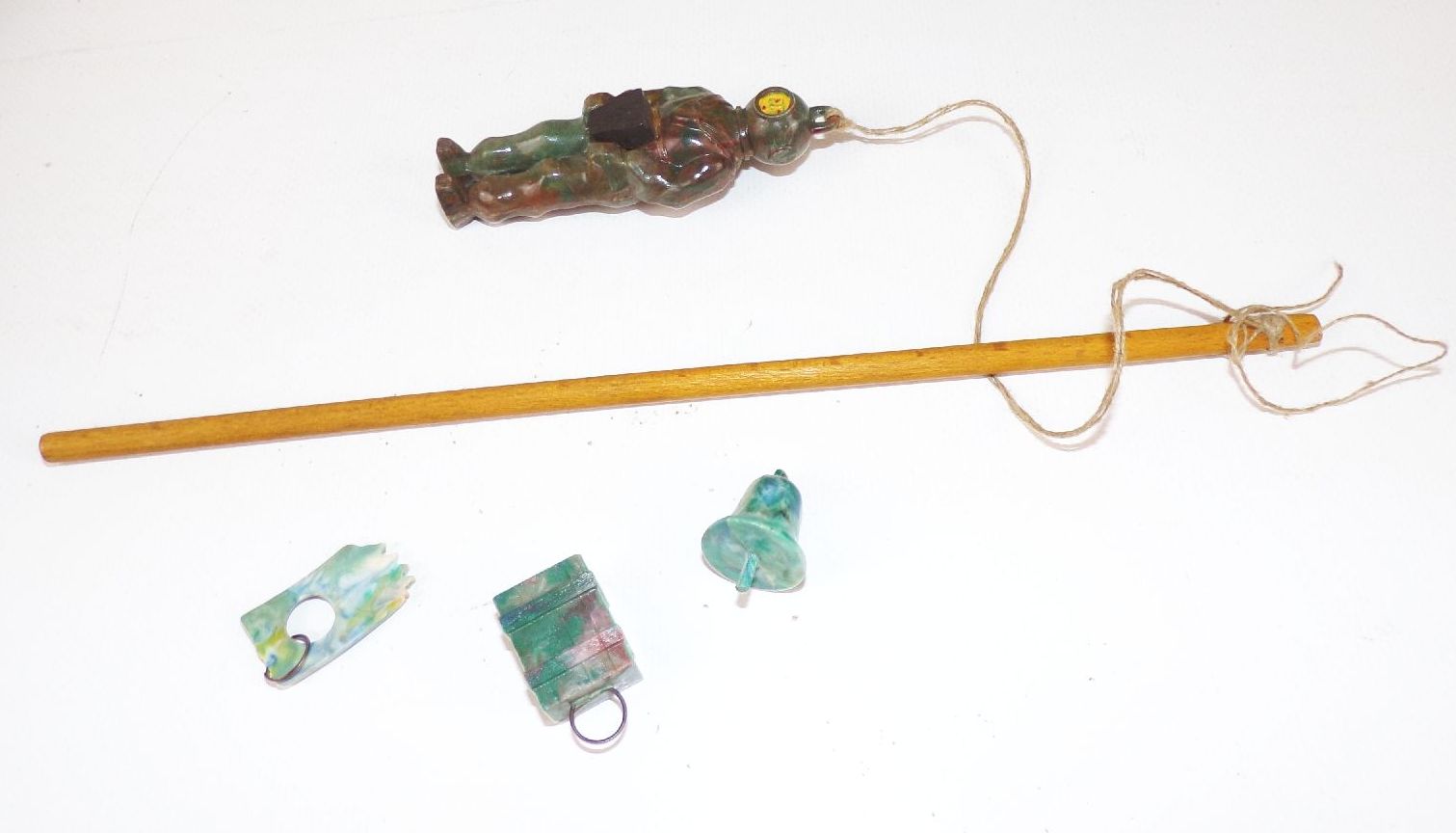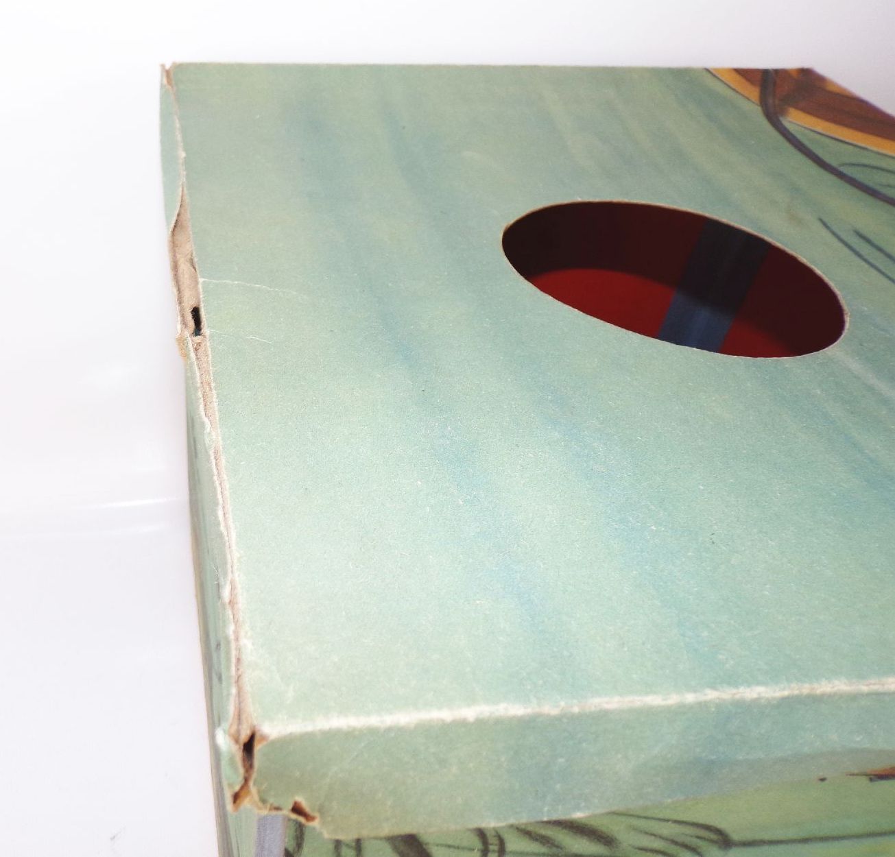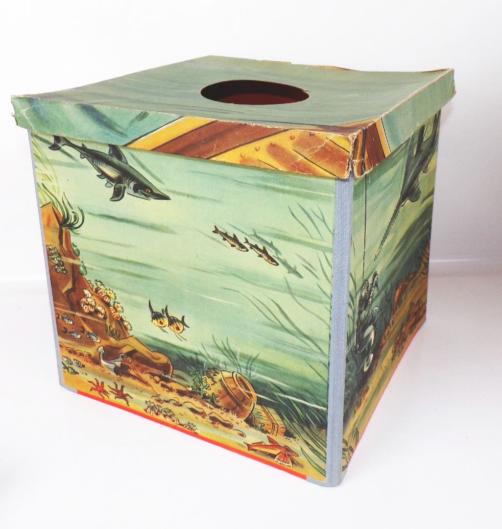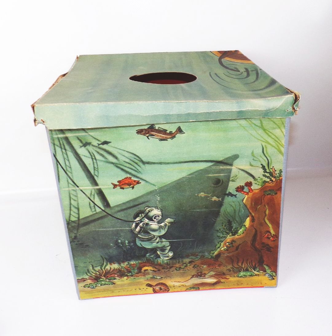 Originales, altes Taucherspiel, ca. um 1950. Maße der Schachtel: 26 x 38,5 x 4 cm. Mit einen Taucher, 3 Gegenständen, Diorama, und der Spielanleitung, welche sich im Inneren des Deckels befindet. Erhaltung: leider fehlen 5 Gegenstände, dem Deckel fehlen 2 Kanten und er ist recht eingedrückt, das Diorama ist an den Kanten und Ecken etwas abgenutzt, alles weitere siehe bitte Fotos.