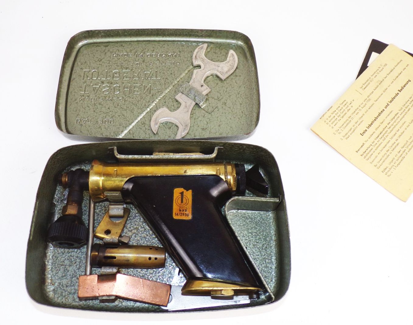 Originales, unbenutztes Taschenlötgerät von BAT. Ca. um 1950. In einer Metallbox, Maße: 20 x 13 x 4,5 cm. Erhaltung: altersbedingte Lagerspuren vorhanden, ansonsten gut, alles weitere auch Fotos. Es wird keine Mehrwertsteuer ausgewiesen, da wir der Differenzbesteuerung nach § 25a UStG unterliegen.