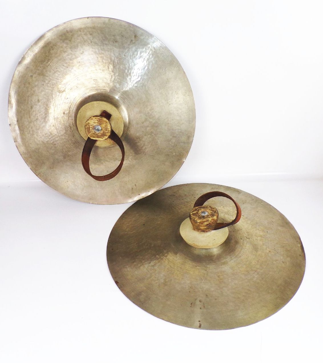 Originales, altes Paarbecken, aus Nachlass einer Musikkapelle. Messing. Durchmesser je 42,5 cm. Mit Lederschlaufen. Erhaltung: Gebrauchsspuren vorhanden, Ränder mit kleinen Dellen, alles weitere siehe bitte Fotos. Es wird keine Mehrwertsteuer ausgewiesen, da wir der Differenzbesteuerung nach § 25a UStG unterliegen.