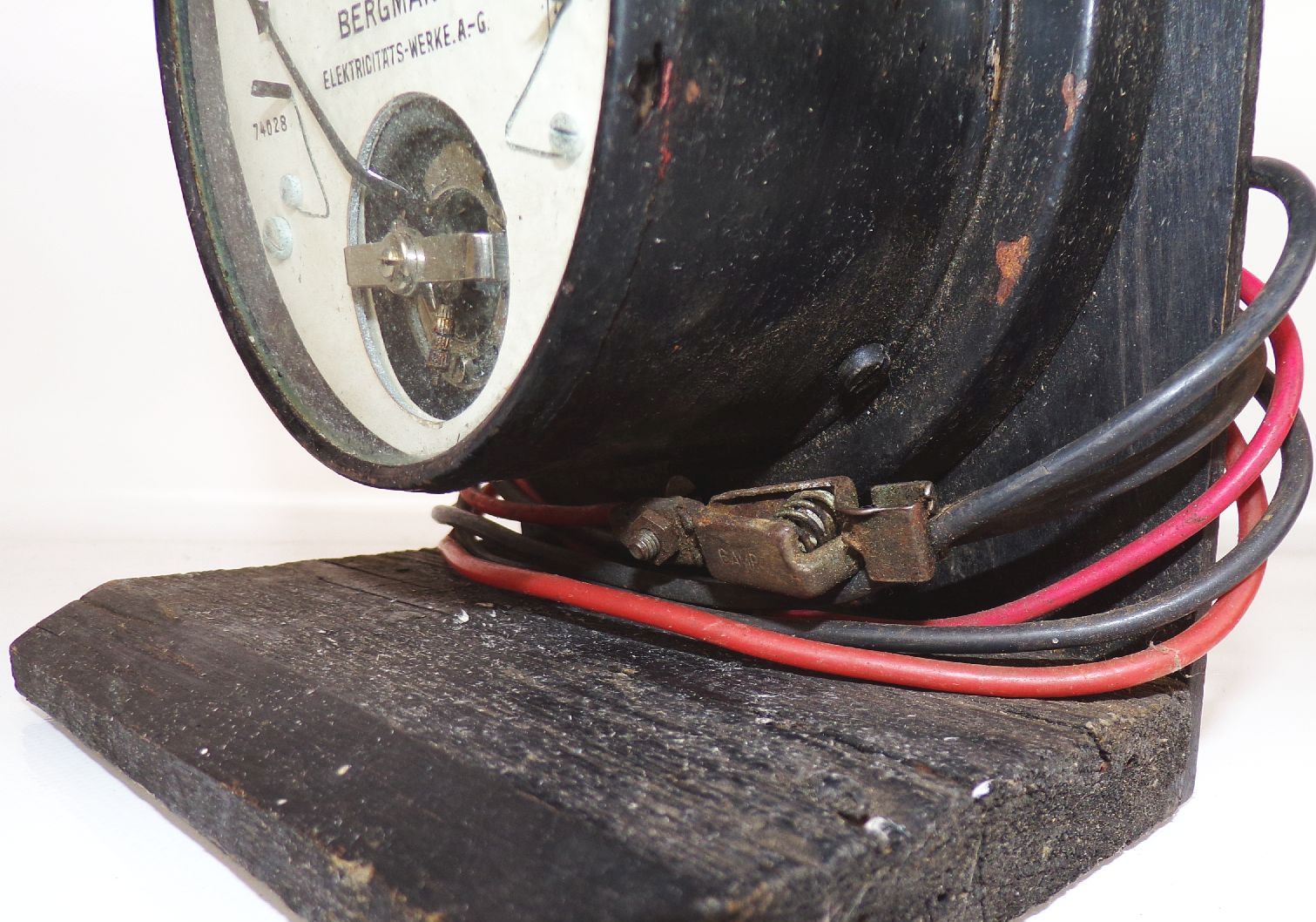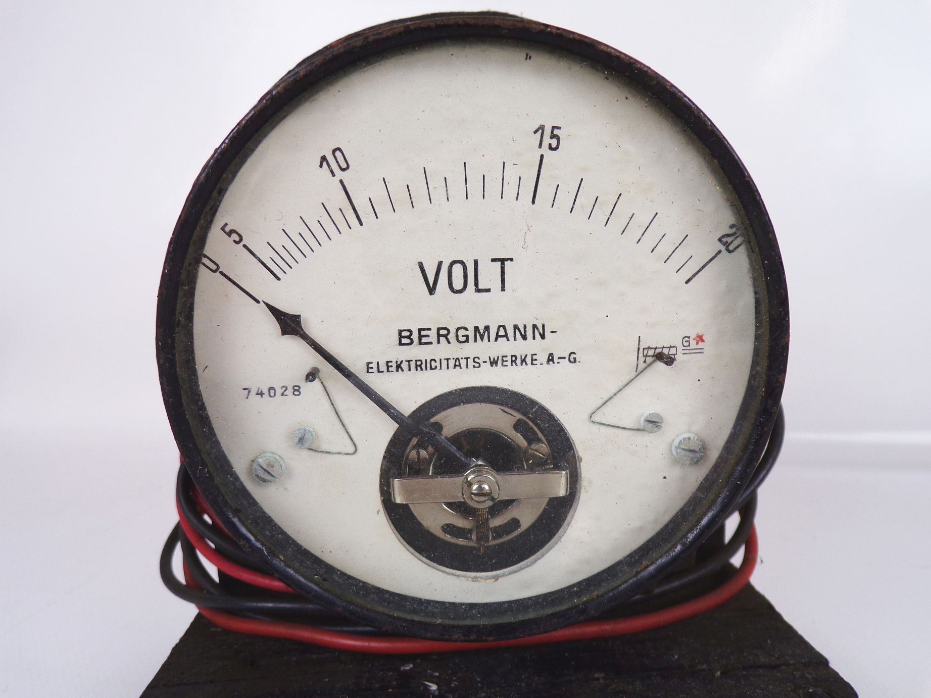 Originales, altes Bergmann Voltmeter, ca. um 1930. Auf Holzsockel aufgeschraubt. Komplettmaße: 15 x 10 x 17 cm. Durchmesser Skala 10,5 cm. Es wurde keine Funktionsprobe durchgeführt. Erhaltung: Farbabriebe und Patina vorhanden, gebraucht, alles weitere siehe bitte Fotos.
