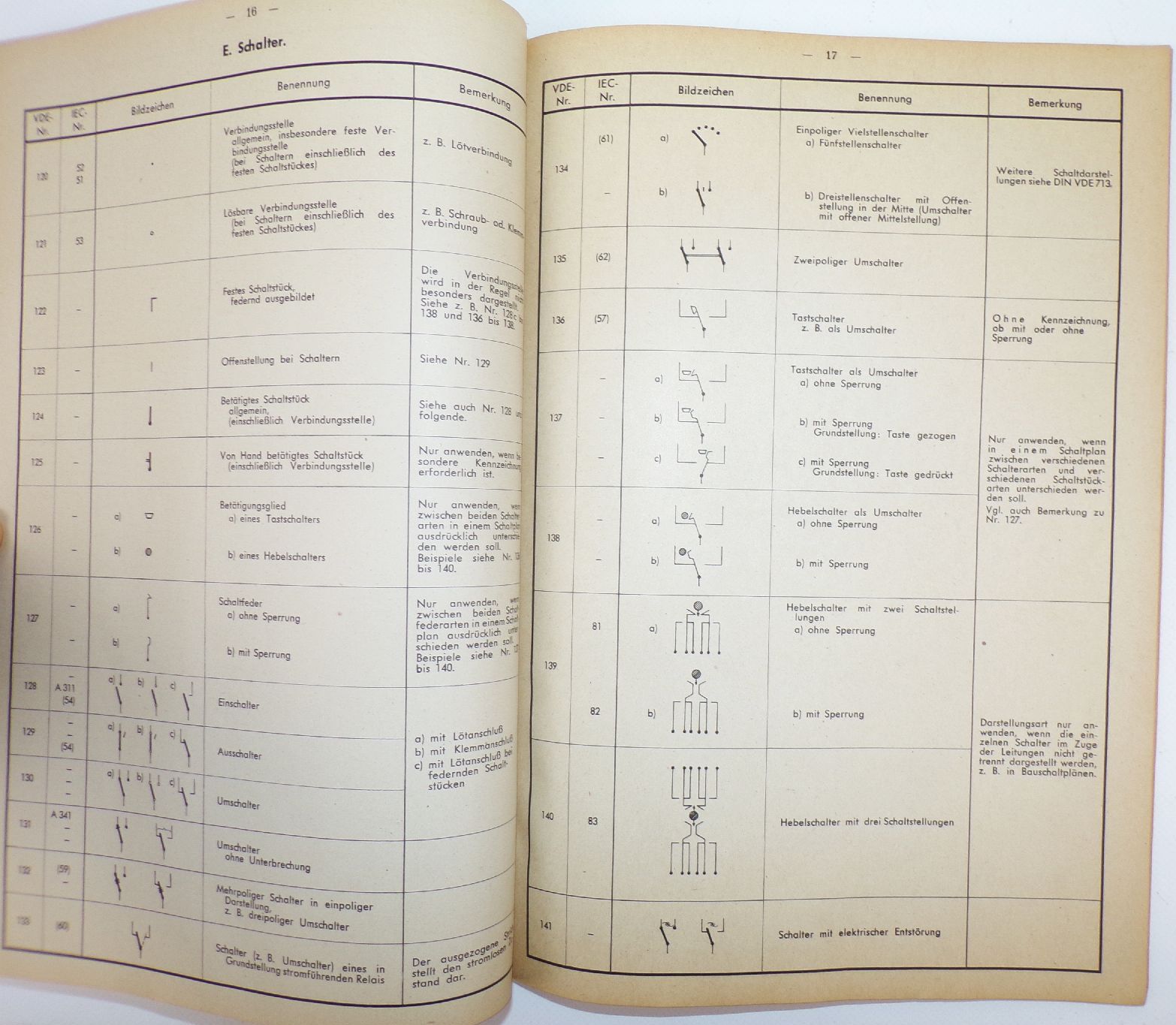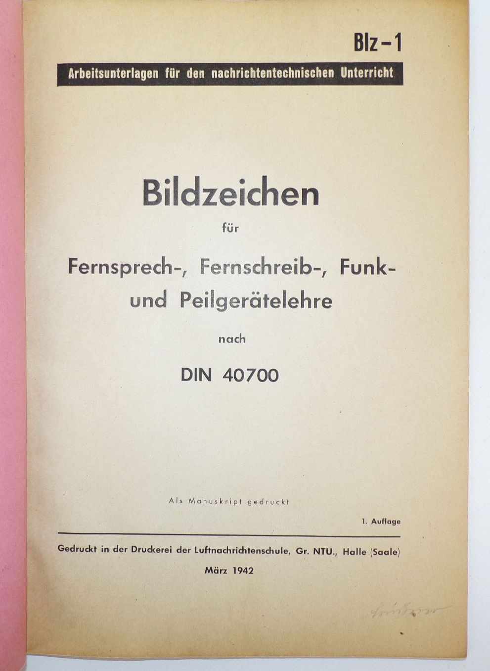 Originale Broschur, Arbeitsunterlagen für den nachrichtentechnischen Unterricht, Bildzeichen für Fernsprech-, Fernschreib-und Funk - und Peilgerätelehre nach DIN 40700. 1 Auflage, als Manuskript gedruckt, in der Druckerei der Luftnachrichtenschule, Halle Saale, März 1942. Format A 4. 54 Seiten. Erhaltung: stellenweise leicht unsauber, ansonsten gut, alles weitere siehe bitte Fotos.