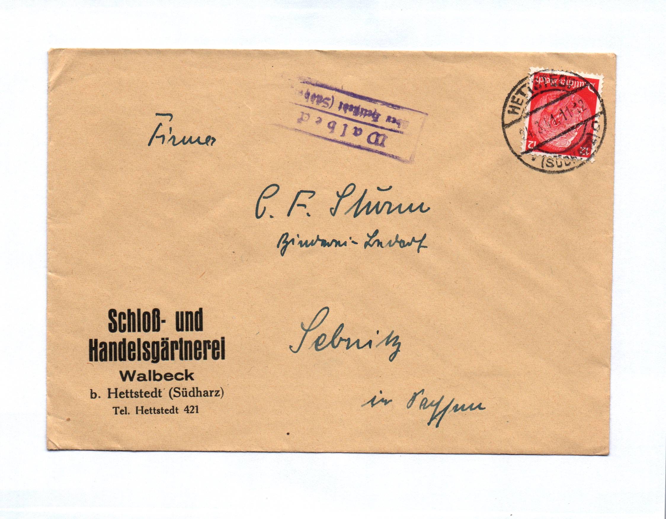 Brief Schloß und Handelsgärtnerei Walbeck bei Hettstedt 1941