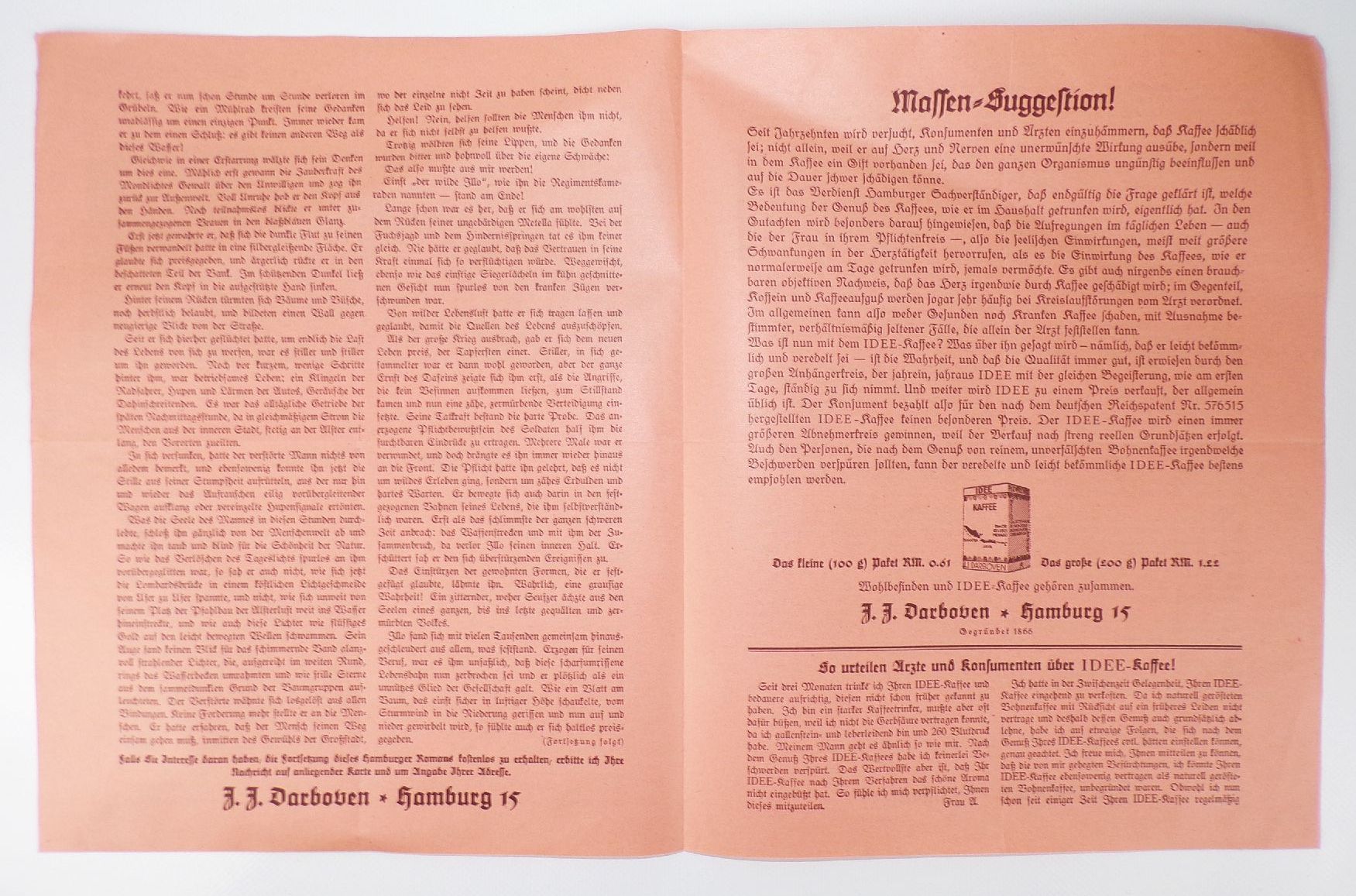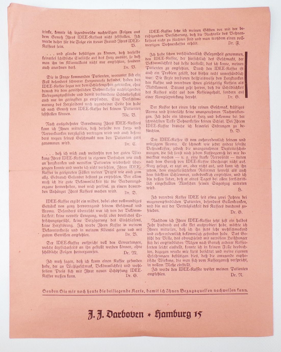Originales, vierseitiges Prospekt, ca. um 1910. Darboven, Hamburg. Format: 22,5 x 29 cm. Erhaltung: gefaltet, ansonsten gut, alles weitere siehe bitte Fotos. Es wird keine Mehrwertsteuer ausgewiesen, da wir der Differenzbesteuerung nach § 25a UStG unterliegen. Interne Lagernummer P5