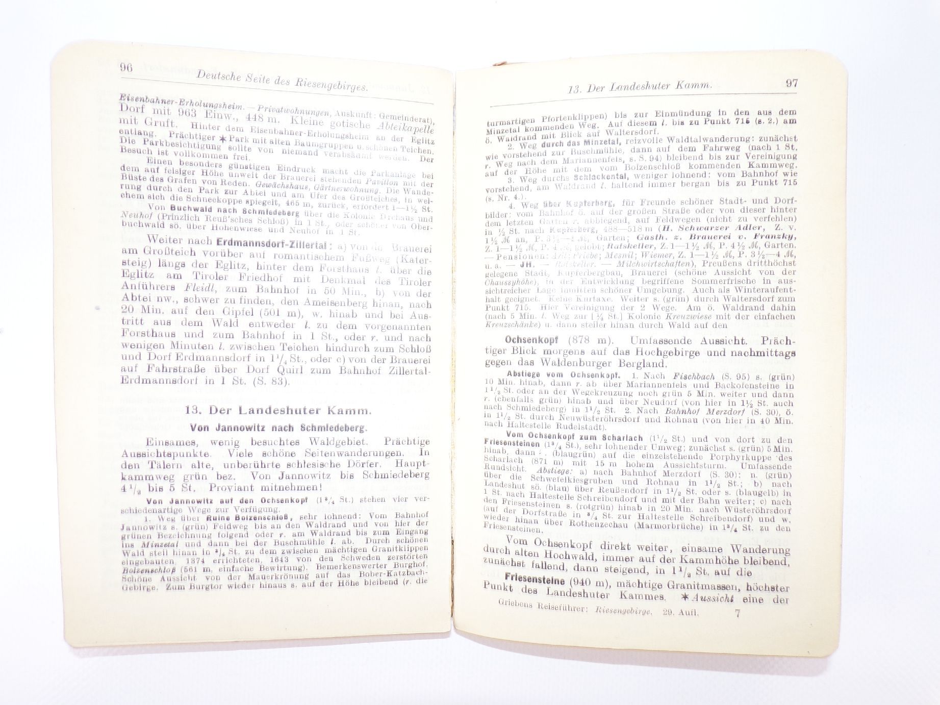 Originaler, alter Grieben Reiseführer, für das Riesengebirge. Band 18, 1927 erschienen. Format: 10 x 15 cm, 172 Seiten. Erhaltung: Buchrücken aufgeschabt, belesen, gebraucht, im hinteren Teil sind Notizen vorhanden, selten ist der Text angestrichen, alles weitere siehe bitte Fotos.