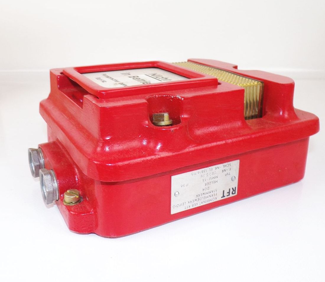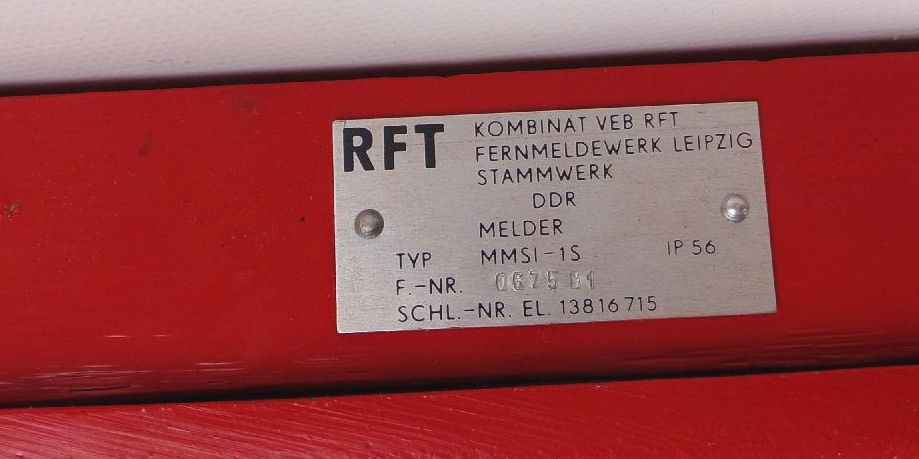 Originaler, alter Feuermelder, aus der ehemaligen DDR. Hersteller RFT, Kombinat VEB RFT, Fernmeldewerk Leipzig Stammwerk. Typ MMSI-1S . Maße: 15 x 18 x 8 cm. Funktion ungeprüft. Wir bieten diesen Artikel ausschließlich aus Ausstellungsstück an. Erhaltung: lagerungsbedingte Gebrauchsspuren vorhanden, ansonsten gut. Karton etwas verblast und fleckig. Alles weitere siehe bitte Fotos.