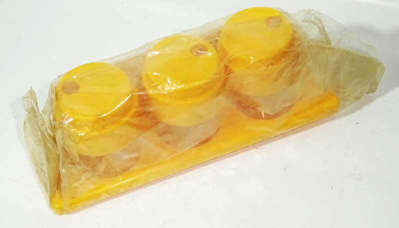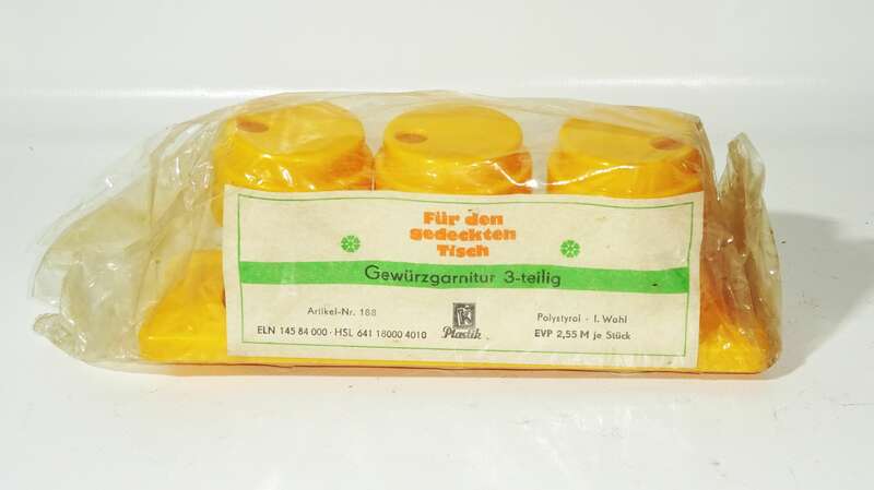 DDR Gewürzgarnitur 3teilig Plastik Gelb Salzstreuer Pfefferstreuer OVP