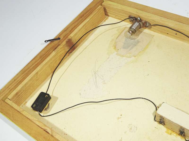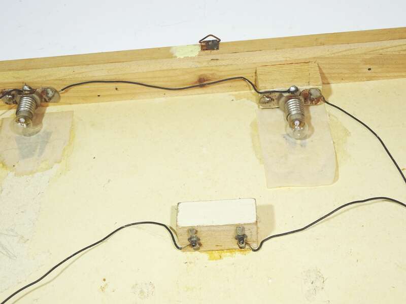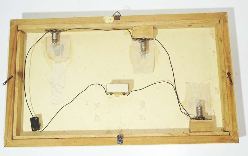 Originale, altes Bild, aus Holz, mit drei beleuchtbaren Laternen.