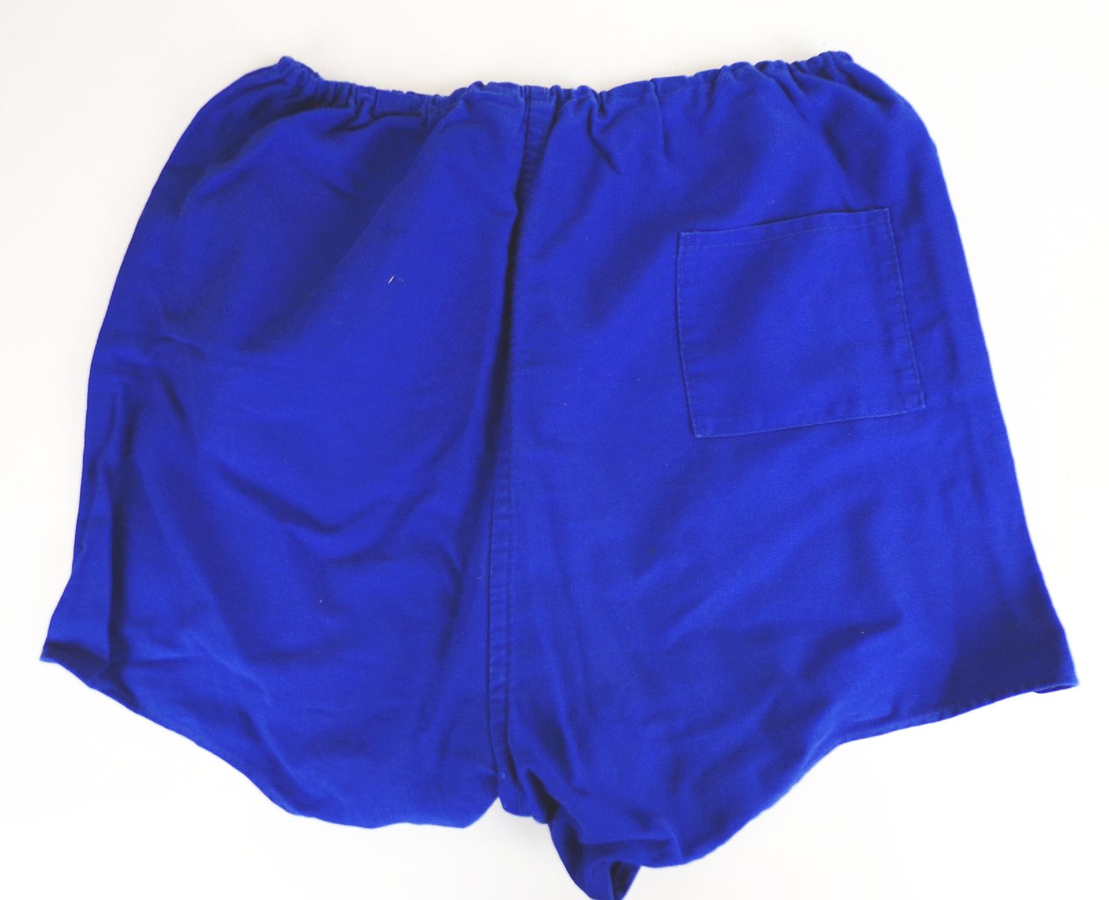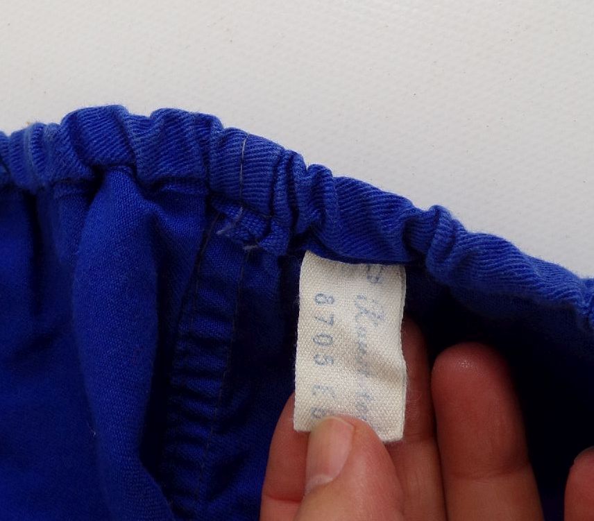 Originale Turnhose, aus der ehemaligen DDR. Größe: 46. Ungewaschener Fundzustand. Erhaltung: getragen mit Tragespuren, alles weitere siehe bitte Fotos. Es wird keine Mehrwertsteuer ausgewiesen, da wir der Differenzbesteuerung nach § 25a UStG unterliegen.