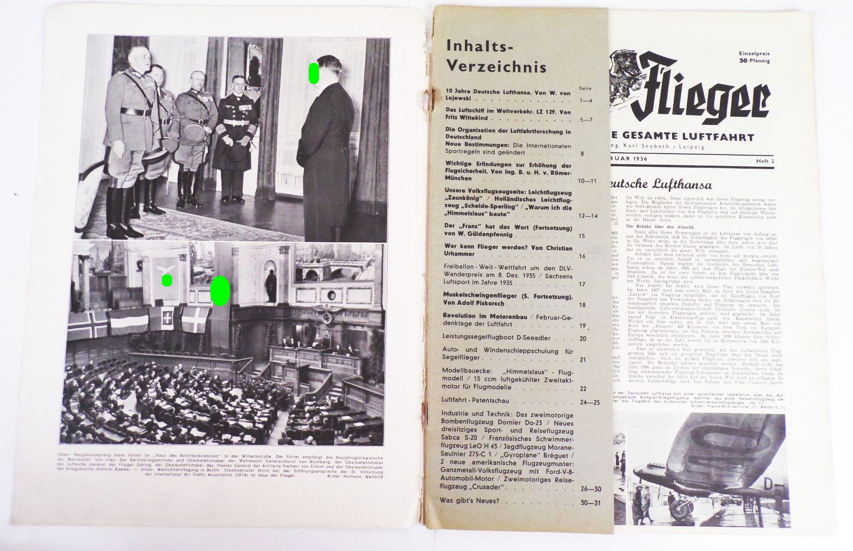 Originale Zeitung, Der deutsche Sportflieger Zeitschrift für die gesamte Luftfahrt. Heft 2 Februar 1936. Zahlreich illustriert. Druck und Verlag Edgar Herfurth & Co. Leipzig. Format: 23 cm x 31 cm. Erhaltung: Einband lose, Heftklammern angerostet, alles weitere siehe bitte Fotos.