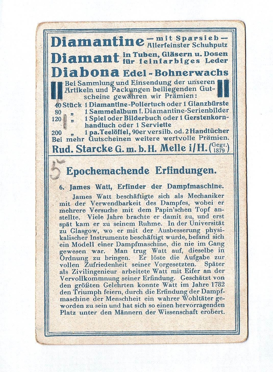 "Diamantine Schuhputz Diabona Rud. Starcke G.m.b.H. Melle Sammelbild James Watt Erfinder der Dampfmaschine"