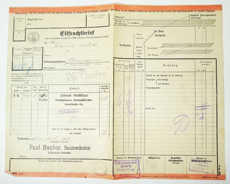 Eil Frachtbrief Paul Hauber Baumschule Dresden nach Bärenstein 1911 Sachsen