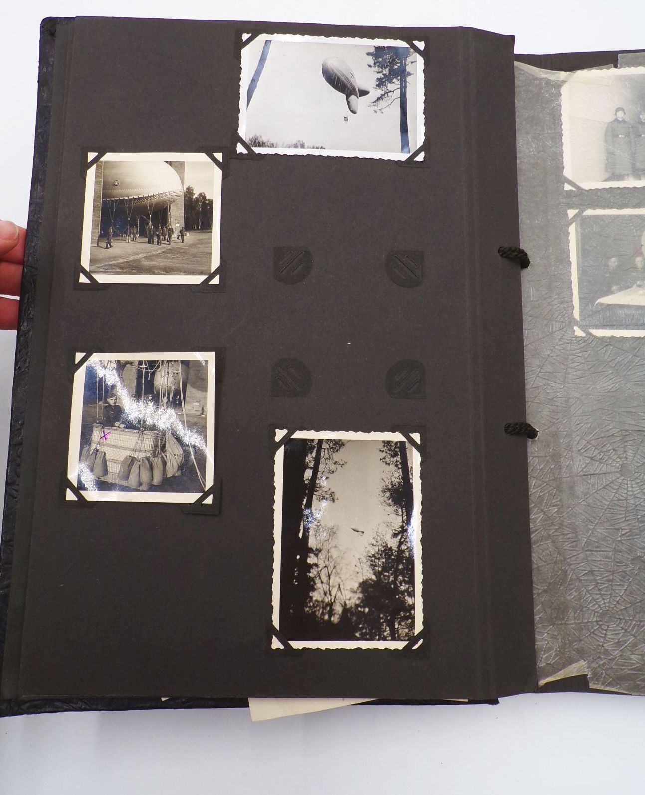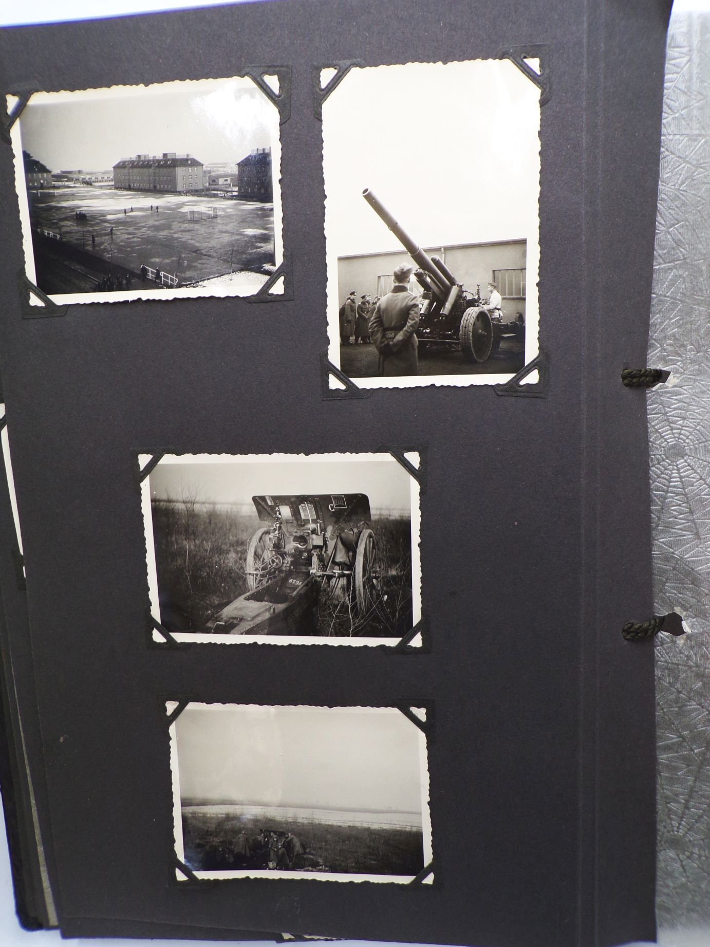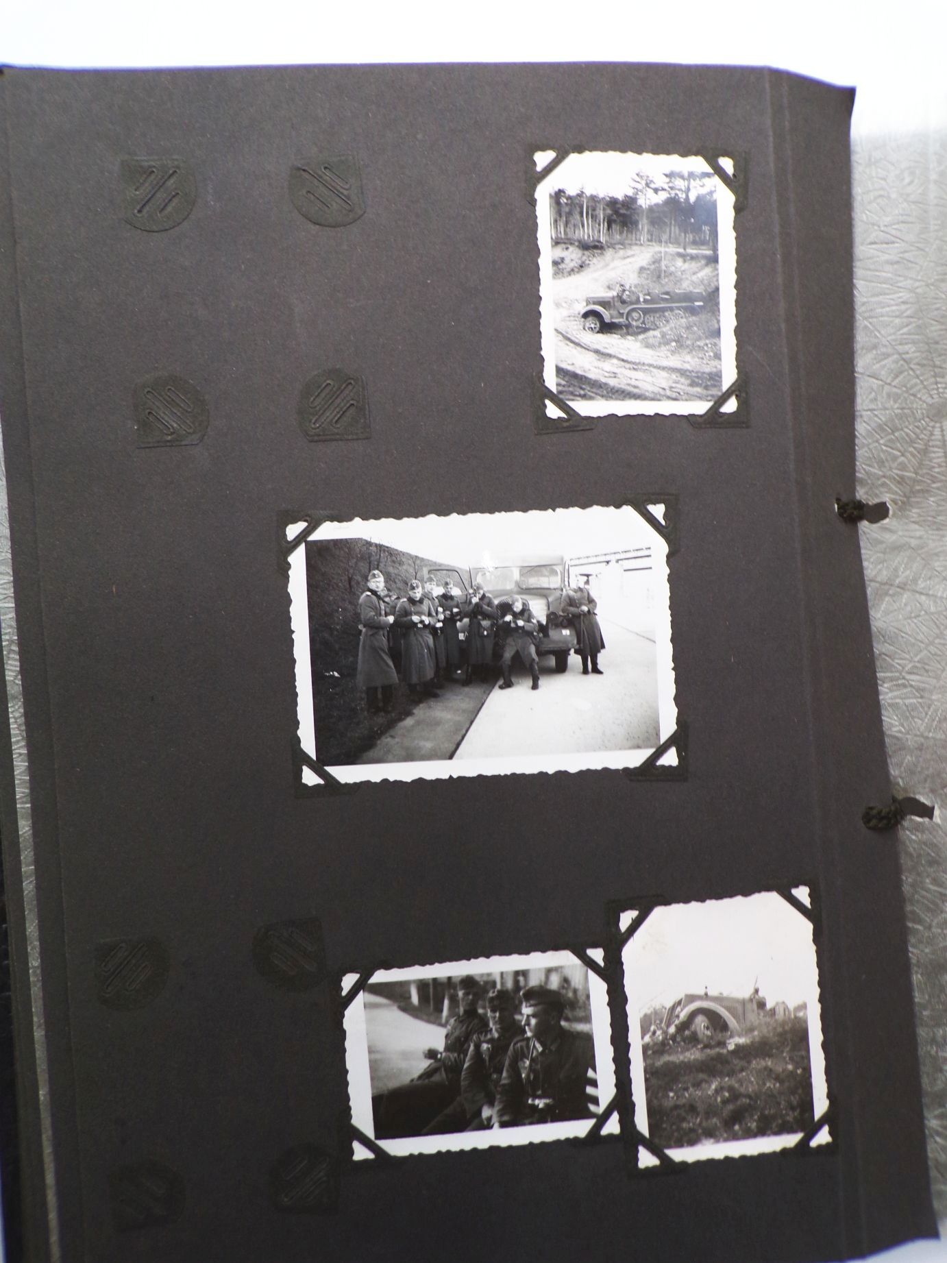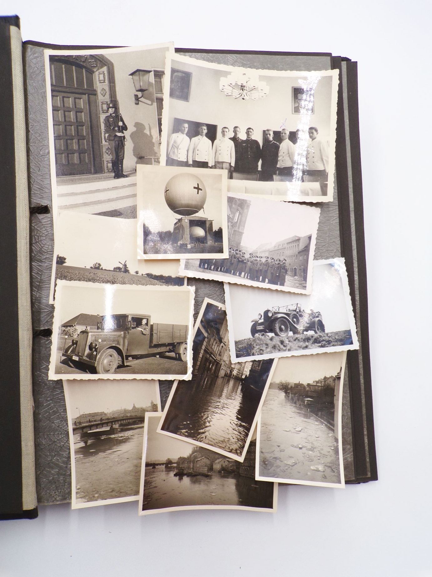 Originales Fotoalbum aus dem 2. Weltkrieg. Beobachtungs Abteilung 4 Meißen. Mit insgesamt 83 Fotos. Welche oftmals lose sind. Das Album weist viele Leerstellen auf, d.h. es waren einmal mehr Fotos enthalten. Album Maße: 23 cm x 31 cm. Erhaltung: Gebrauchsspuren vorhanden, Buchdeckel entnazifiziert ( Kreuz rausgeschabt ), Bindung leicht gelockert, ansonsten gut, alles weitere siehe bitte Fotos.