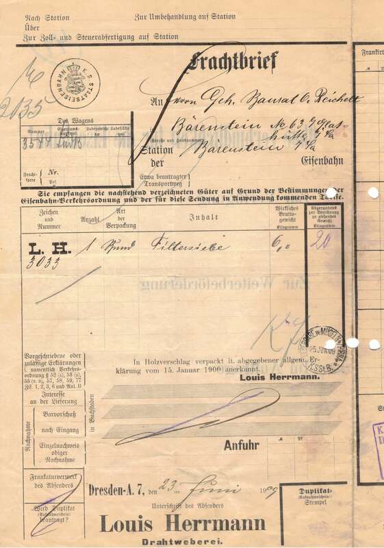 Frachtbrief Louis Herrmann Drahtweberei Dresden nach Bärenstein 1909