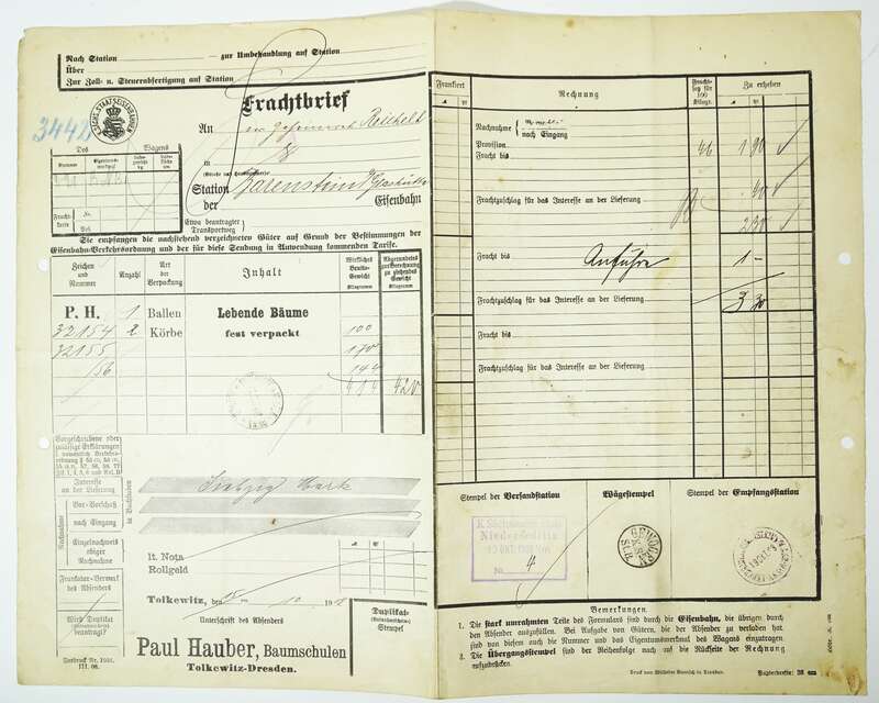 Frachtbrief Paul Hauber Baumschule Tolkewitz Dresden nach Bärenstein 1908 Stempel