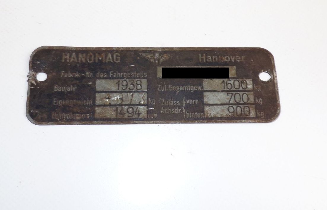 Originales, altes Typenschild, für einen Hanomag Traktor, Baujahr 1938. Maße: 12,5 x 4 cm. Die Schwärzungen sind nicht auf dem Original vorhanden. Ungereinigter Fundzustand. Erhaltung: Gebrauchsspuren, Patina und Verunreinigungen vorhanden, alles weitere siehe bitte Fotos. Es wird keine Mehrwertsteuer ausgewiesen, da wir der Differenzbesteuerung nach § 25a UStG unterliegen. Interne Lagernummer O10