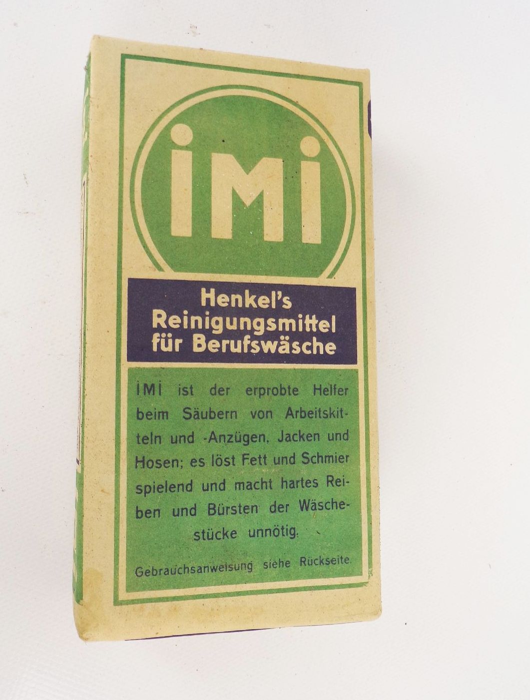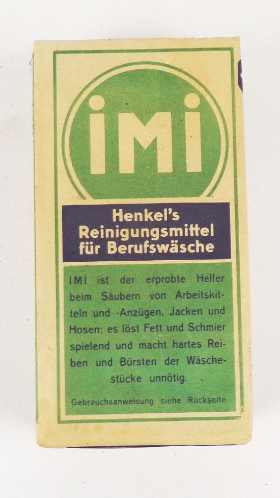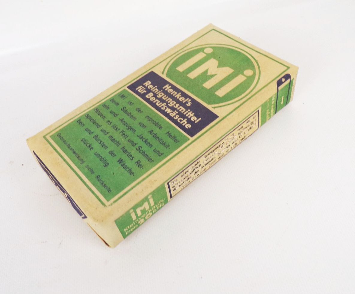 Jeweils 1 originale Packung IMI Reinigungsmittel, aus den 1930iger Jahren. Maße: 8 x 16 x 3 cm. Mit originalen Inhalt, welcher aber fest geworden ist. Ideal für Sammler alter Reklame, Dekorateure oder als Requisit. Erhaltung: farblich leicht verblast, alles weitere siehe bitte Fotos.