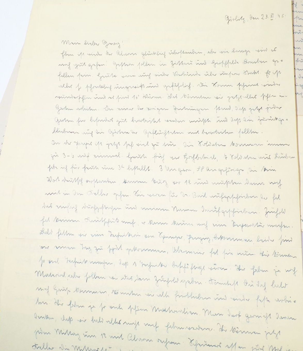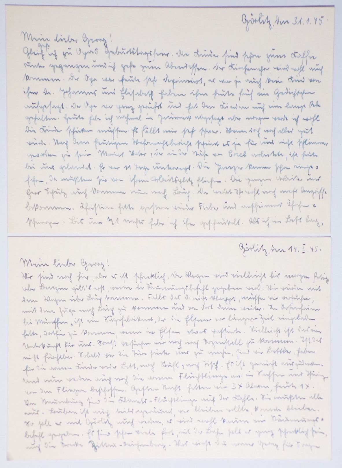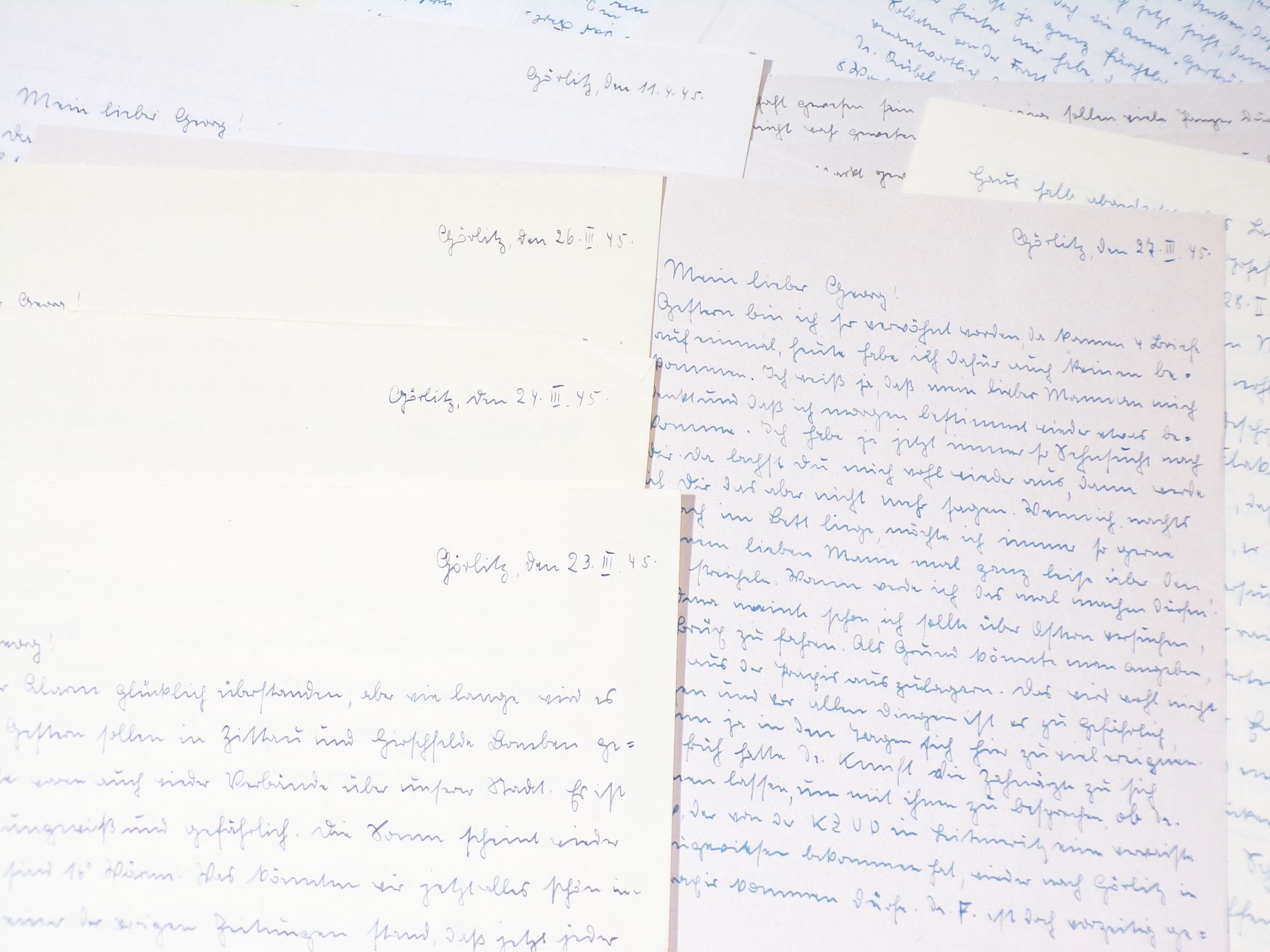 - Die Briefe schildern inhaltlich die Themen der Zeit, z.B. Flüchtlingswelle in Görlitz, Lebensumstände, Räumungsbefehle, volle Bahnstrecken, Fliegeralarm. Voranschreiten der Russen, Schicksale Bekannter und Verwandter.