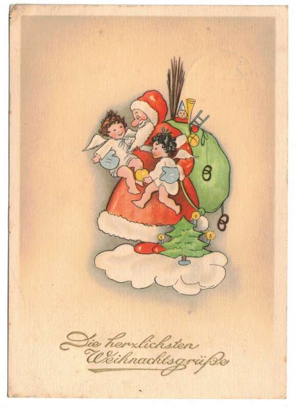 Künstler Ak Weihnachtsmann mit Sack und Engeln Weihnachten Gruss 1949