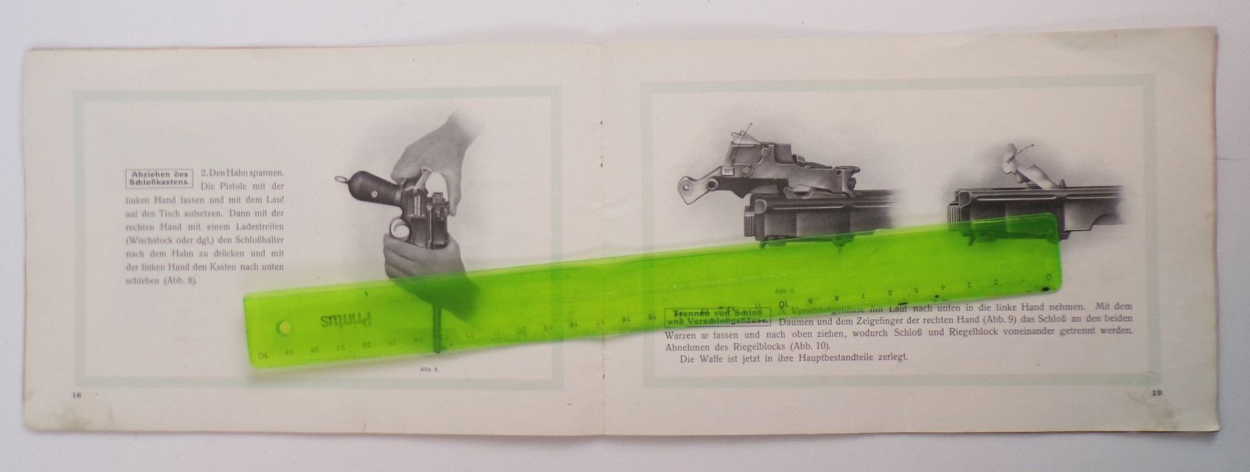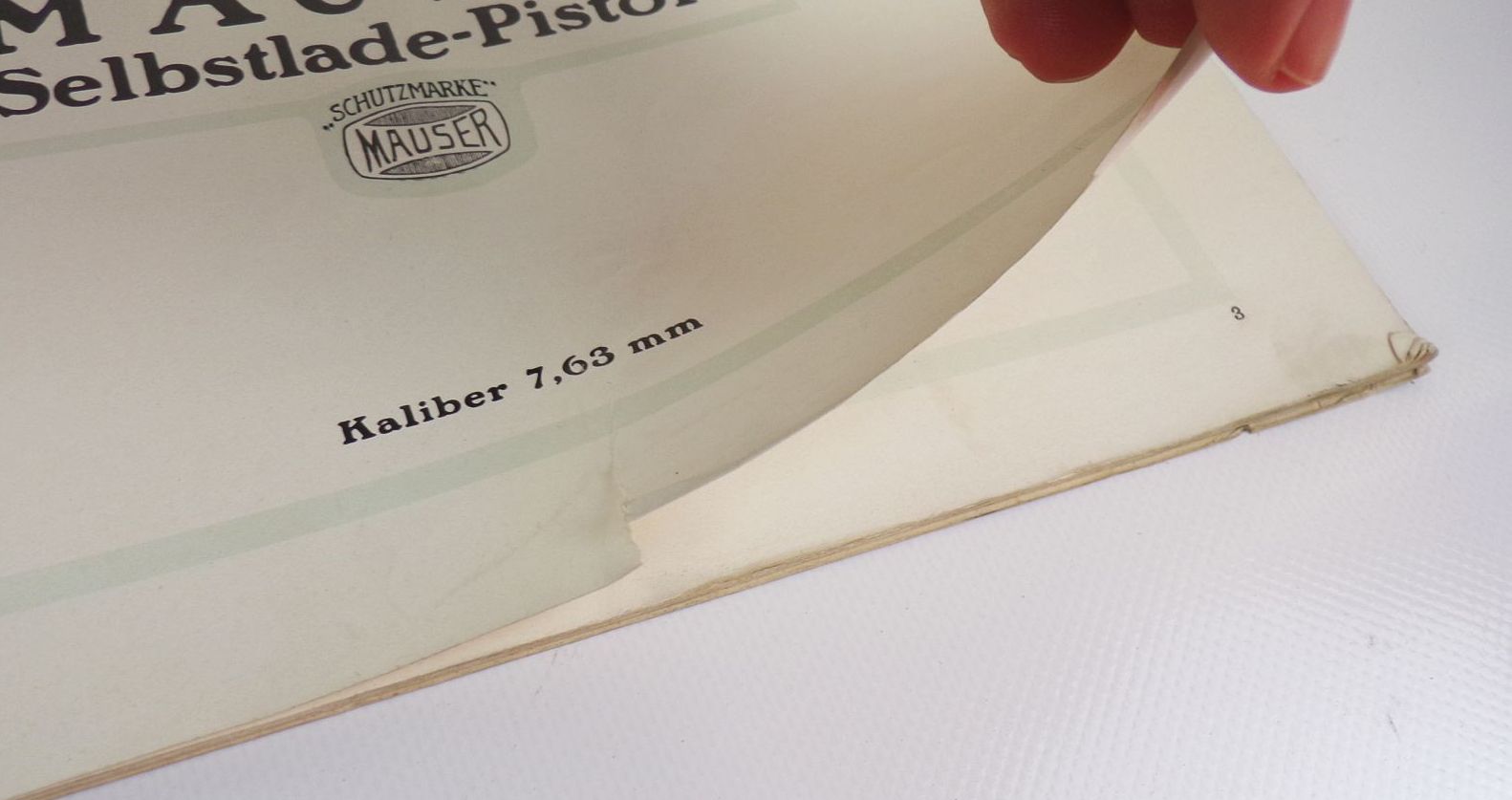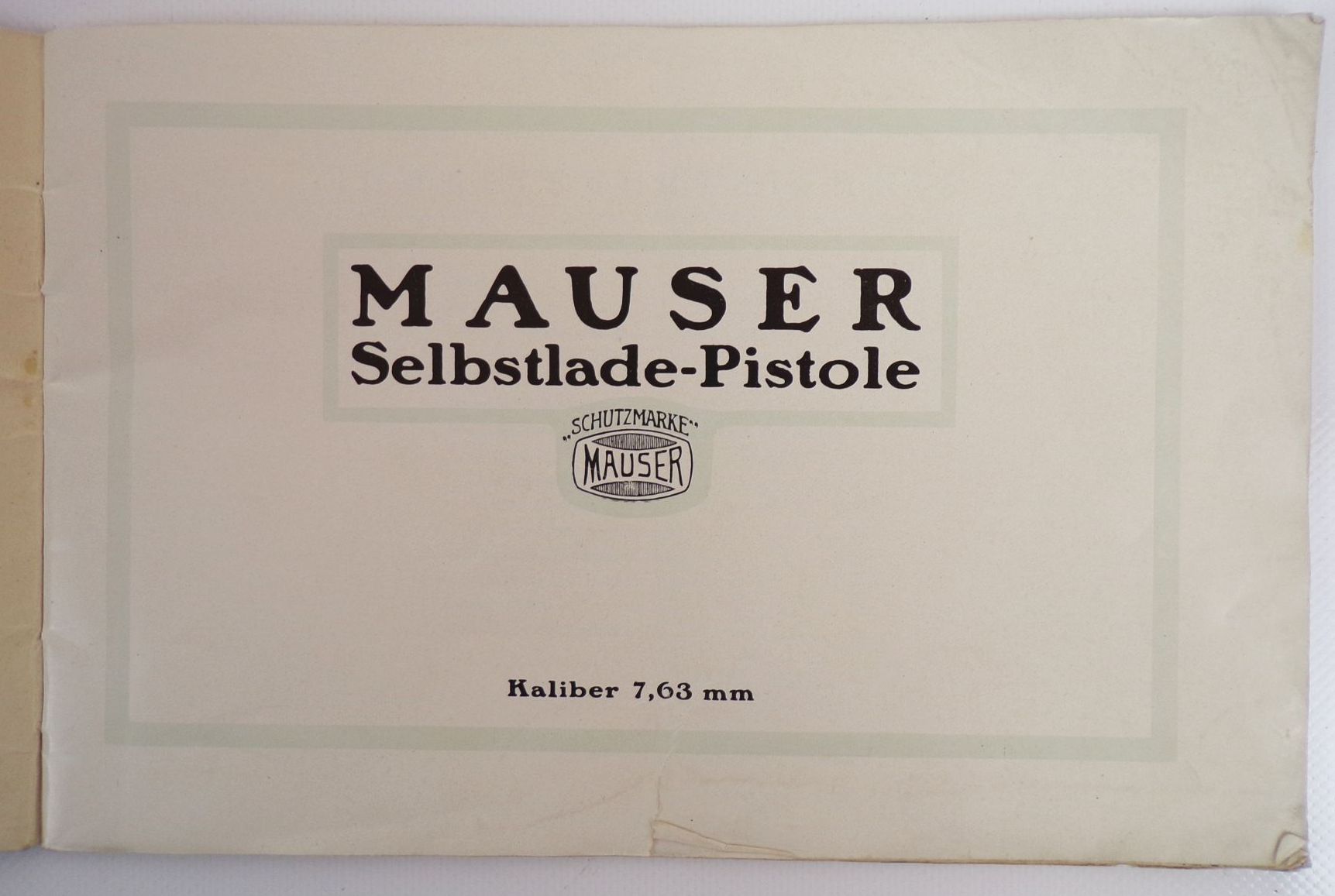 Originale, alte Gebrauchsanweisung für die, Mauser Selbstlade Pistole Kaliber 7,63 mm. Querformat: 23 cm x 15 cm. 30 Seiten. Erhaltung: Titelblatt und erste Seite mit je einen kleinen Einriss, bestoßen, belesen, alles weitere siehe bitte Fotos.
