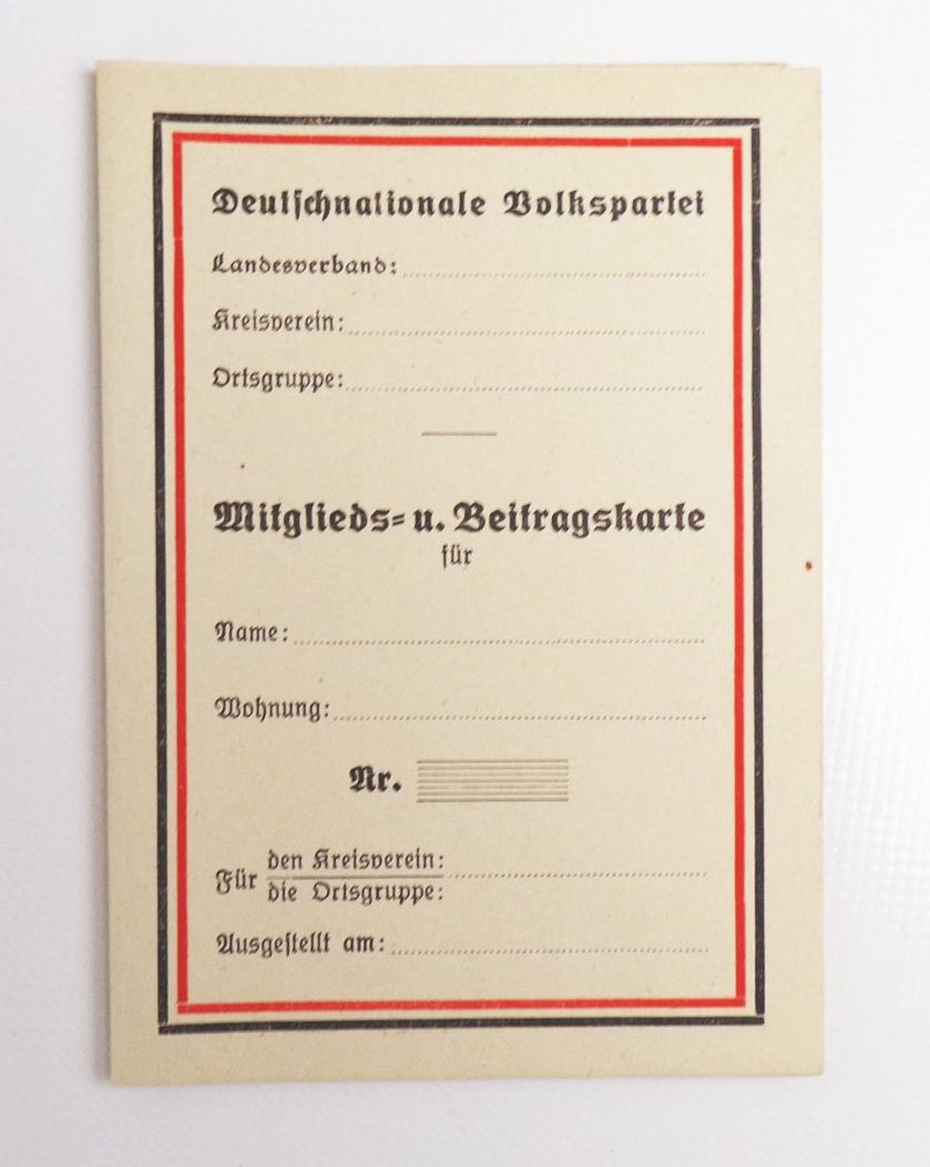 50 blanko Dokumente der Deutschnationalen Volkspartei, 1932. Teilweise ist Weißwasser angegeben. Drei Mitgliedskarten sind beschriftet, wurden aber nicht mitgezählt. Papiere befinden sich alle in Postkartenhüllen. Erhaltung: sehr guter, gebrauchter Zustand, siehe bitte Fotos.