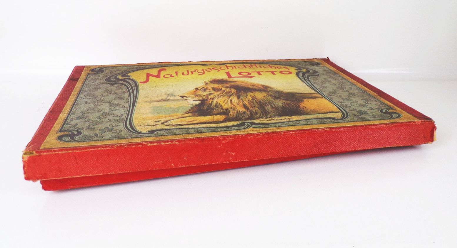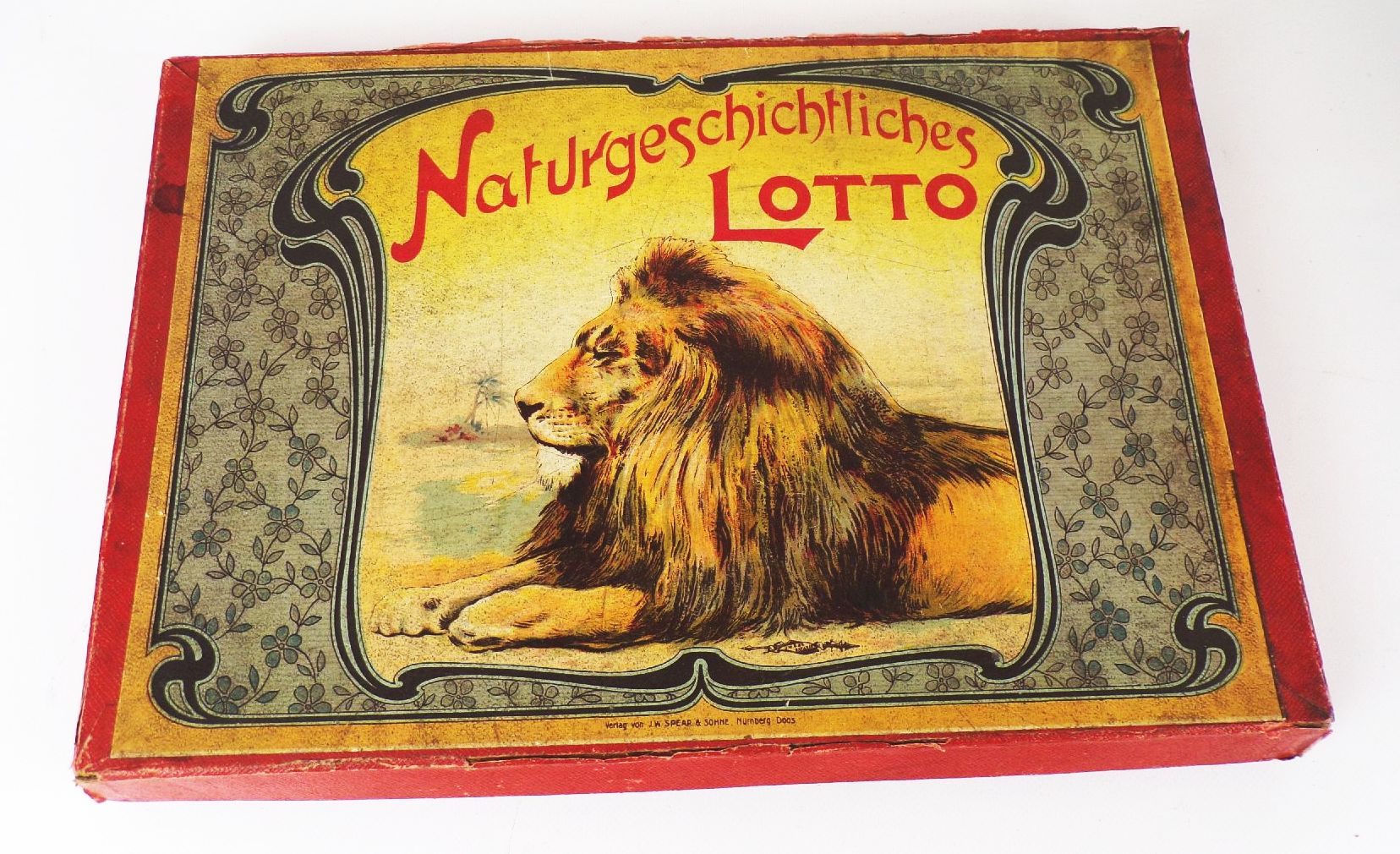 Originales, vollständiges Legespiel, von Spear und Söhne, Nürnberg. Ca. um 1900 erschienen. Naturgeschichtliches Lotto. Mit 6 Bildtafeln, und je 12 kleinen Bildtäfelchen. Maße der Schachtel: 38 x 25,5 x 3 cm. Erhaltung: Schachtel leicht unsauber, Eckkanten gelöst, altersbedingte Gebrauchsspuren vorhanden, alles weitere siehe bitte Fotos.