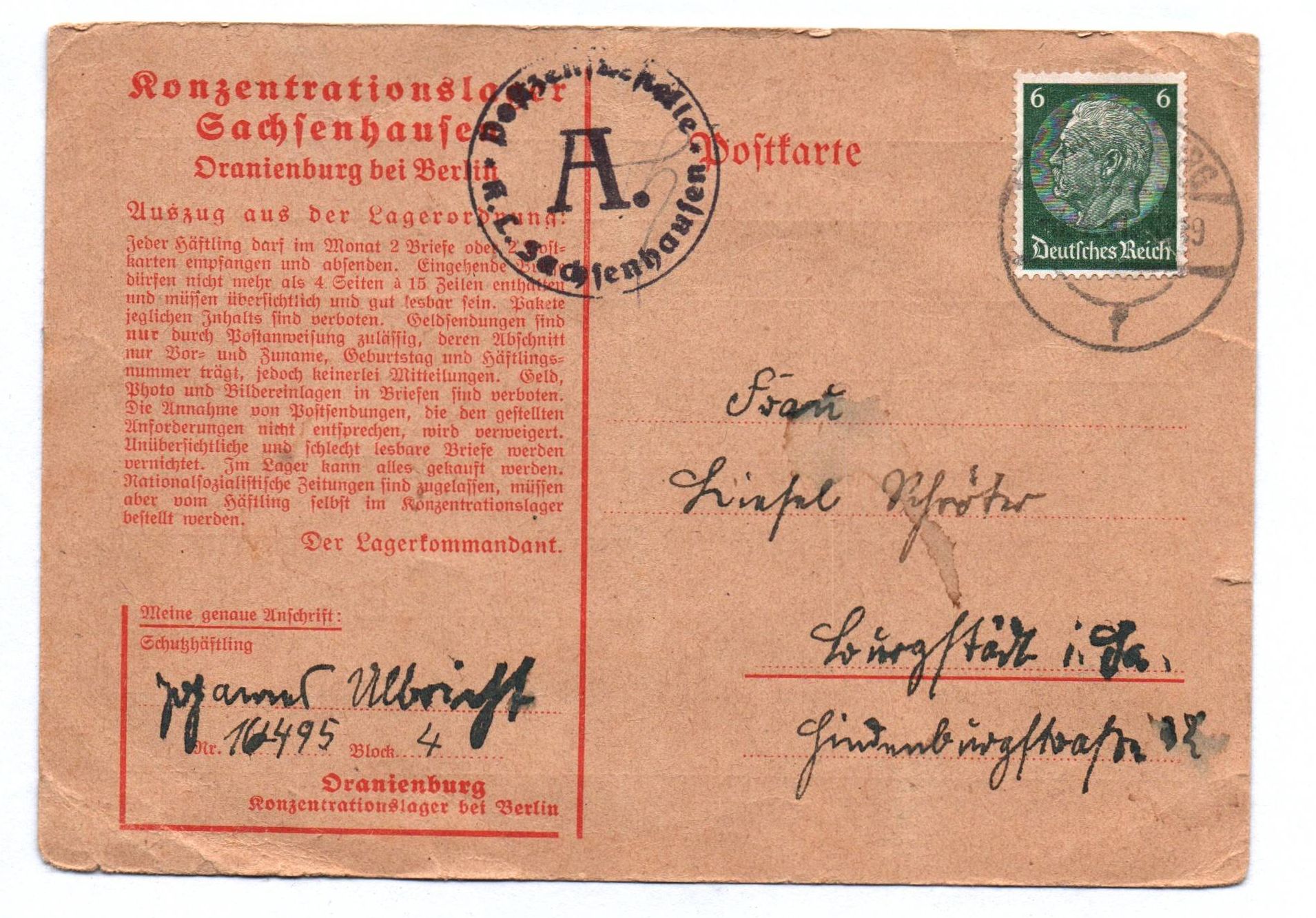 Postkarte KZ Sachsenhausen 1941 Block 4 nach Burgstädt