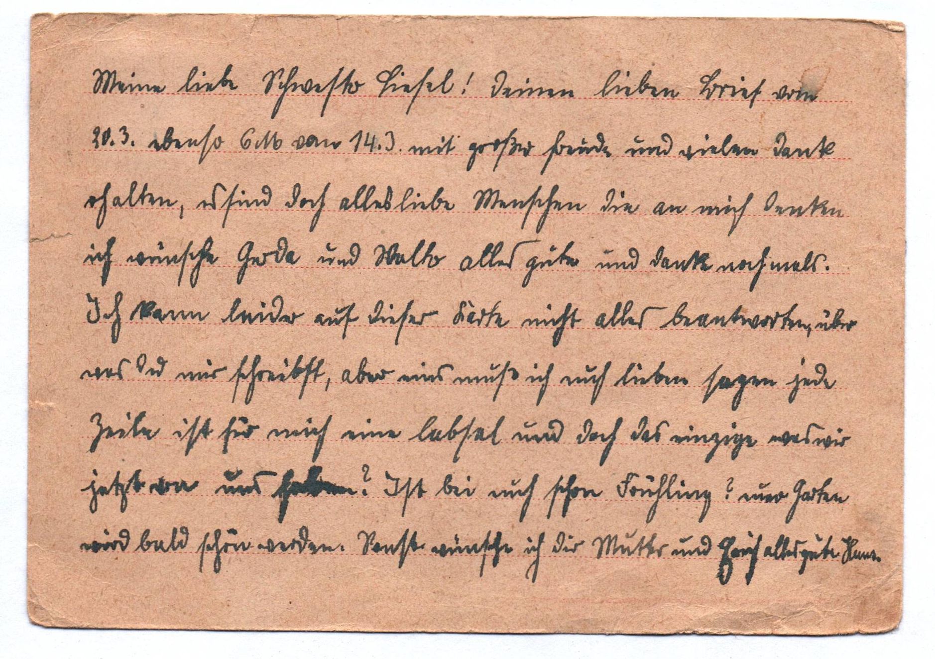 Originale Postkarte, aus dem KZ Sachsenhausen, 1941. Erhaltung: Ecken bestoßen, rechte Kante mit kleinen Einriss, alles weitere siehe bitte Scans. Es wird keine Mehrwertsteuer ausgewiesen, da wir der Differenzbesteuerung nach § 25a UStG unterliegen.
