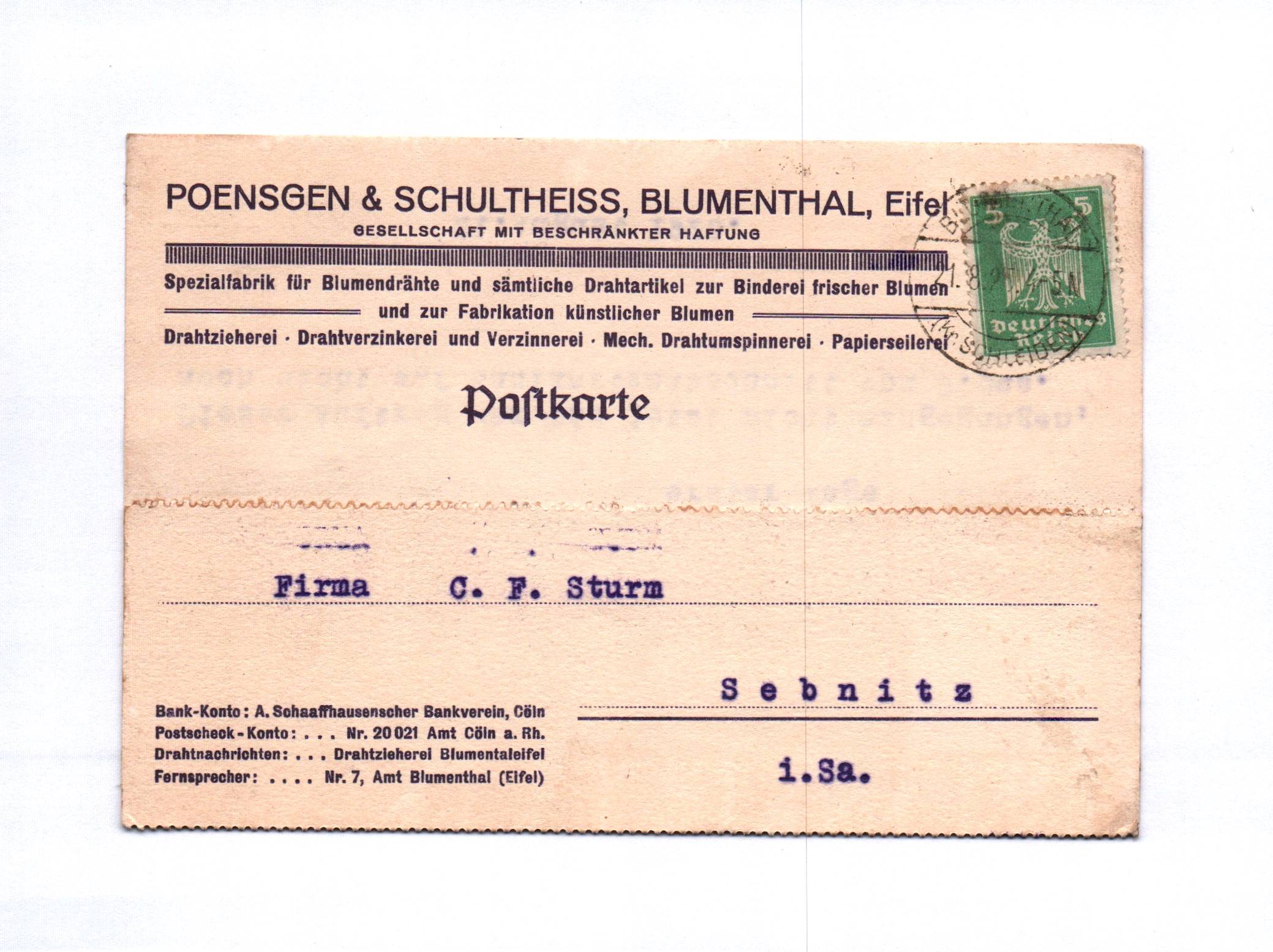 Postkarte Poensgen Schultheiss Blumenthal Eifel Spezialfabrik 1925