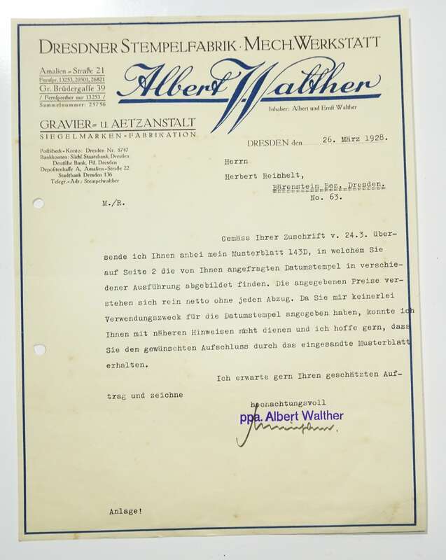 Originales 5teiliges Lot, bestehend aus einen Prospekt und vier Dokumenten mit Briefköpfen, der Firma Dresdner Stempellfabrik Gravieranstalt Albert Walther, Dresden, 1928.