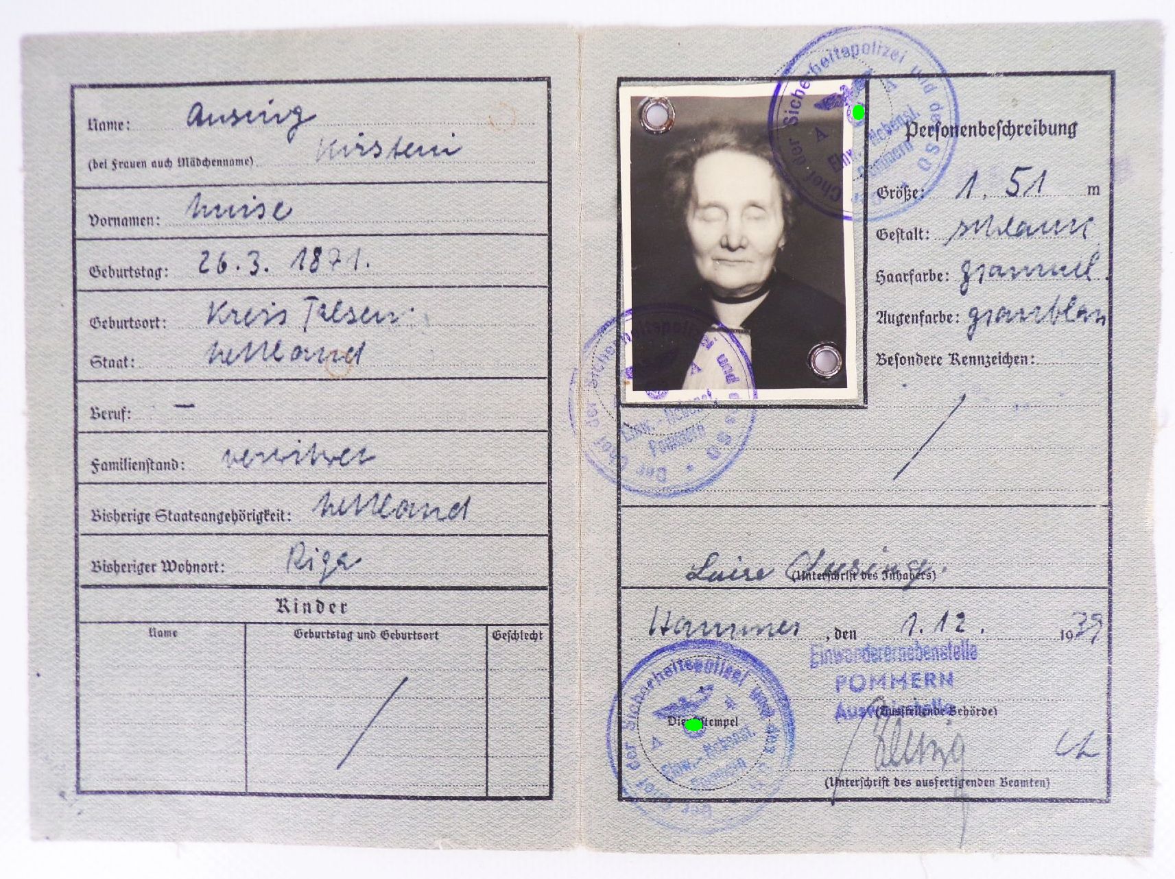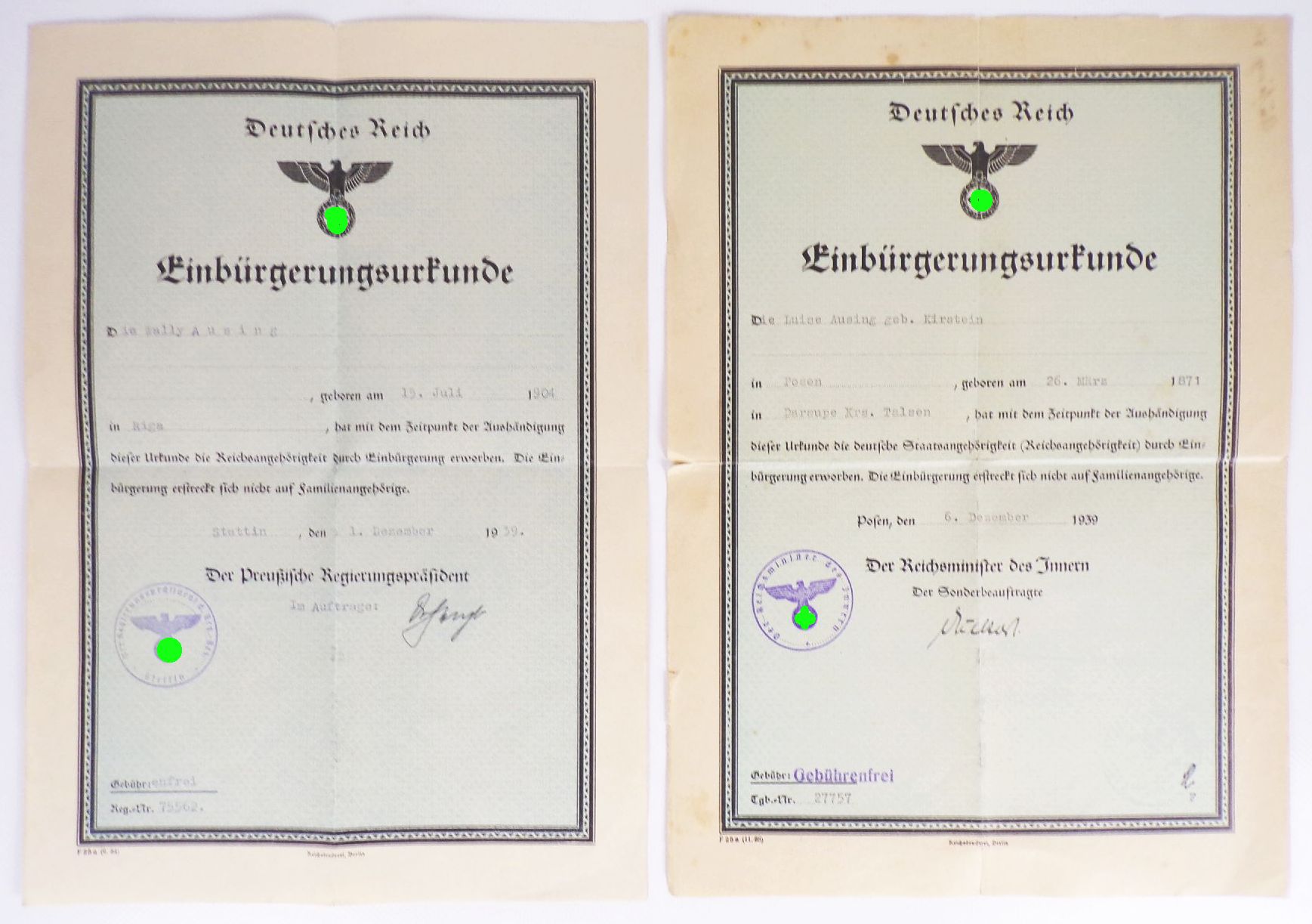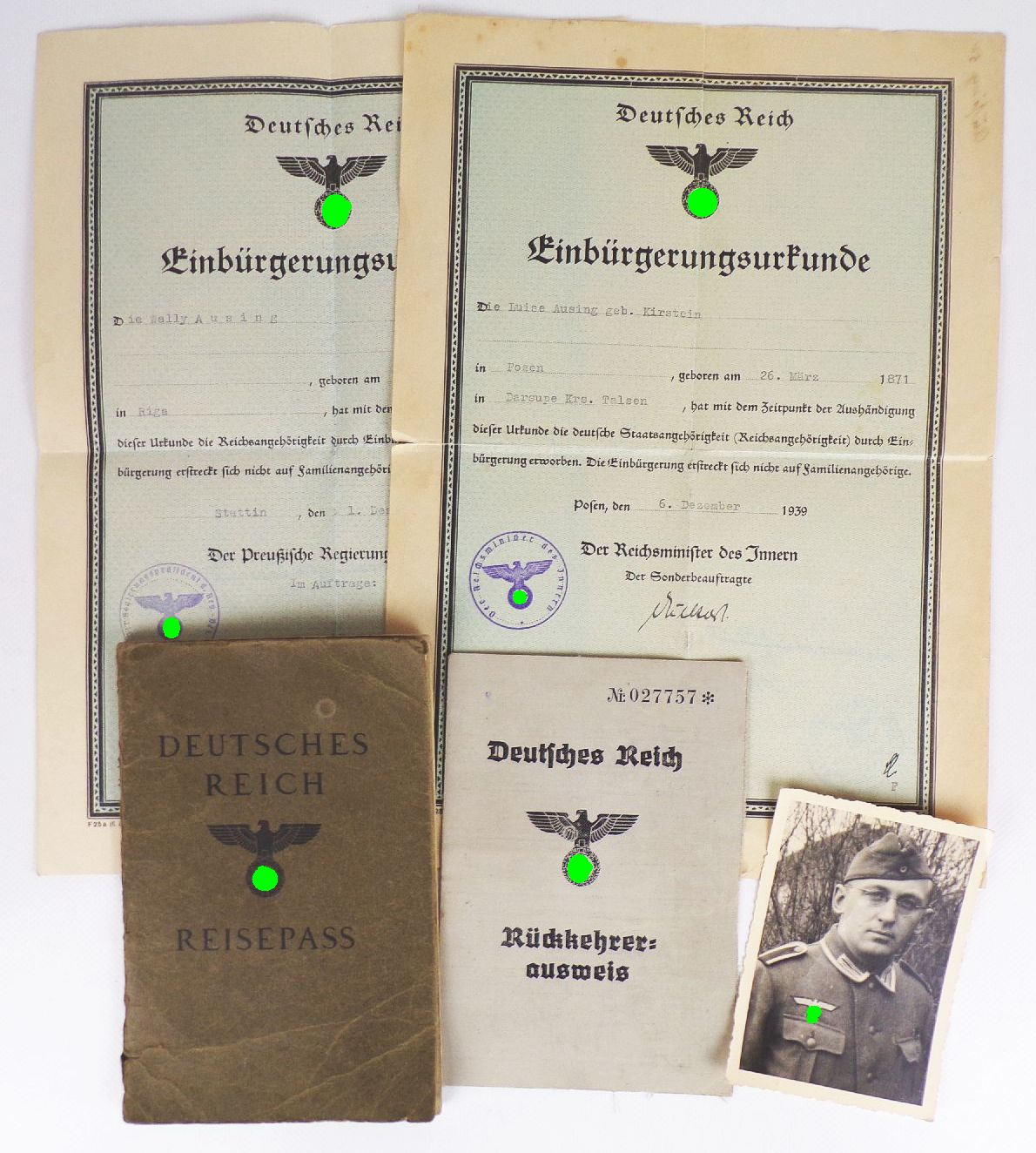 Originaler Papiernachlass, bestehend aus einen Rückkehrer - Ausweis, einem Foto, zwei Einladungen, einen Reisepass und zwei Einbürgerungsurkunden. Alles aus der Zeit des dritten Reiches, und alles aus einen Familiennachlass. Erhaltung: teilweise gefaltet, belesen, gebraucht. Ansonsten gut erhalten, siehe bitte auch Fotos. Die grünen Markierungen sind natürlich nicht auf den Originalen vorhanden.