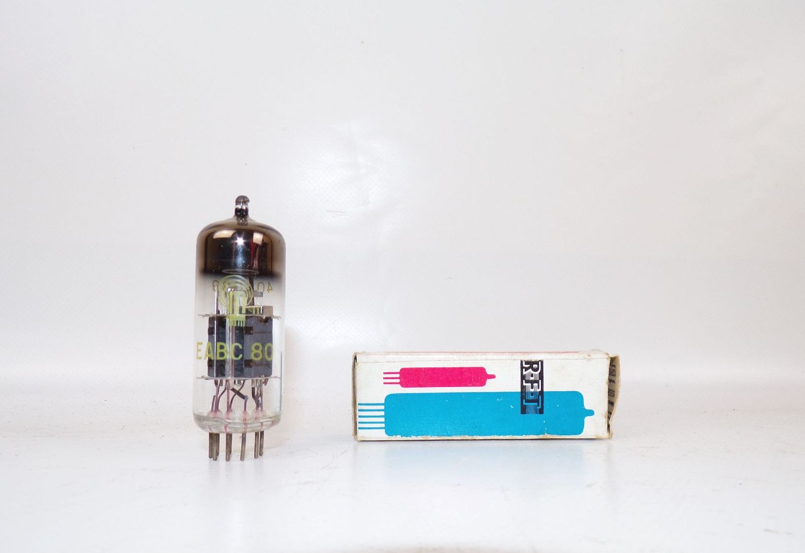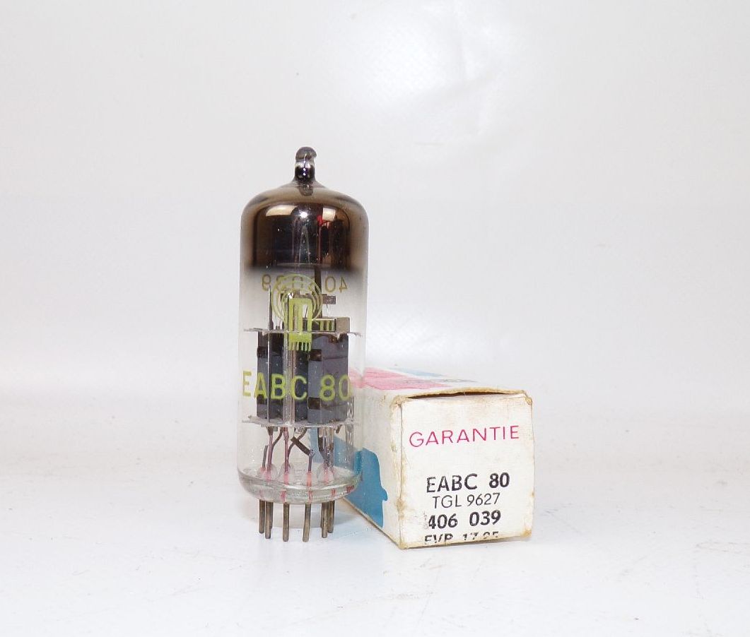 Jeweils 1 originale RFT Röhren EABC80 in OVP. Ungeprüft. Erhaltung: Röhren optisch gut, Schachtel teilweise etwas ramponiert. Alles weitere siehe bitte Fotos. Es wird keine Mehrwertsteuer ausgewiesen, da wir der Differenzbesteuerung nach § 25a UStG unterliegen.