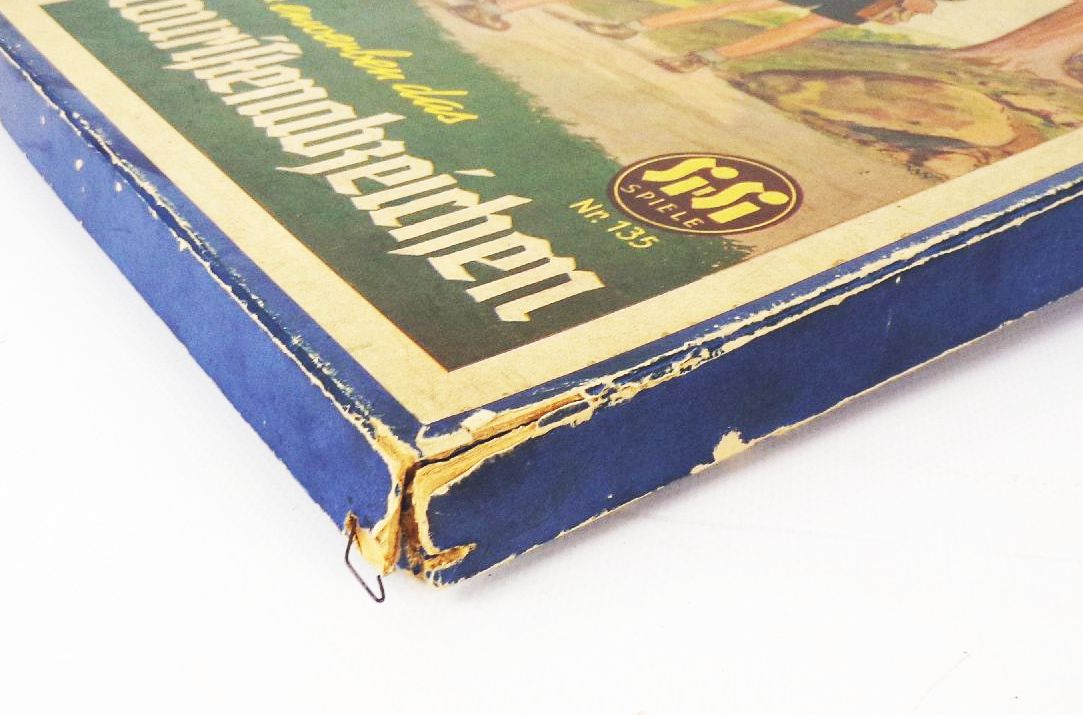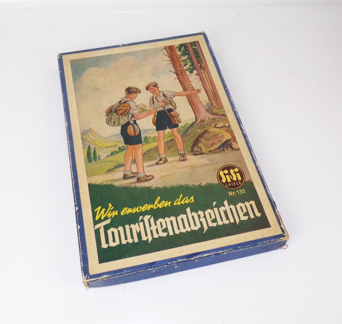 Originales Brettspiel, 1955 erschienen. SiSi, Wir erwerben das Touristenabzeichen. Mit einem Spielplan, 6 Kunststoff - Spielfiguren, einen Glaswürfel, und der Spielanleitung, welche sich im Inneren des Deckels befindet. Maße der Schachtel: 21 x 30,5 x 2 cm. Erhaltung: Eckkanten der Schachtel etwas bestoßen und teilweise gelöst, bespielt, mit leichten Gebrauchsspuren vorhanden, alles weitere siehe bitte Fotos.