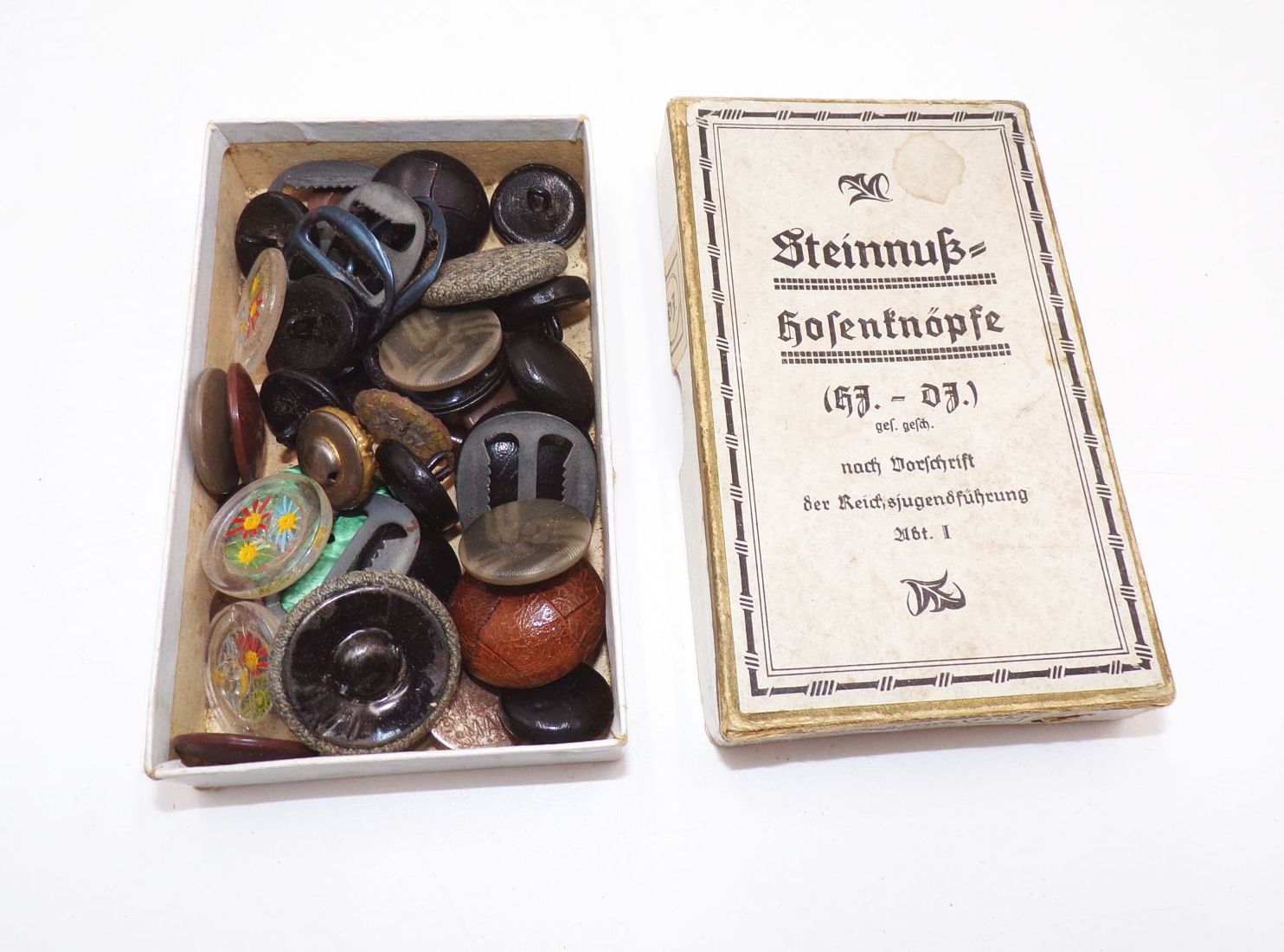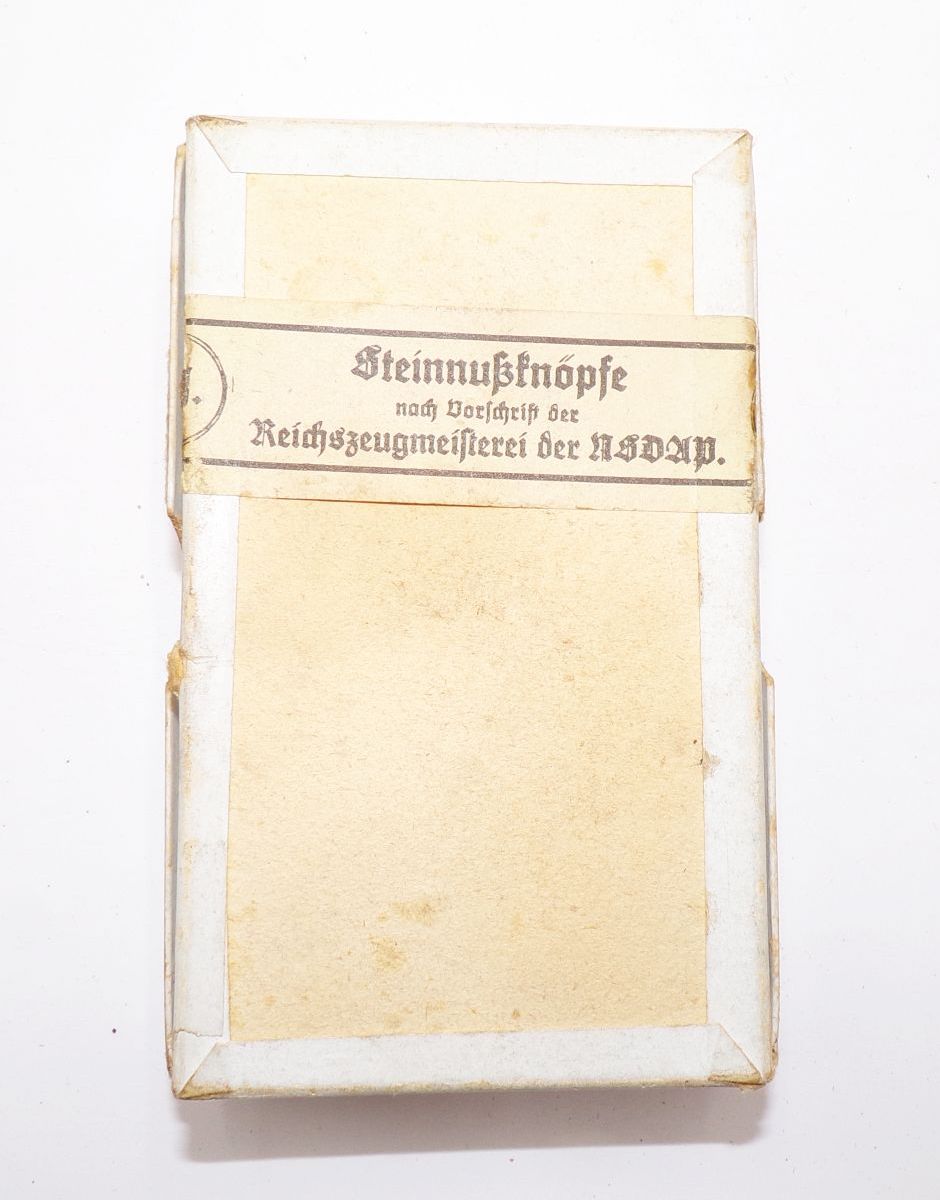Originale Pappschachtel, mit interessanter Beschriftung, aus dem Dritten Reich. Maße: 11,5 cm x 7 cm x 2,5 cm. Voll mit alten Knöpfen. Erhaltung: gebrauchter, guter Zustand, siehe bitte auch Fotos. Es wird keine Mehrwertsteuer ausgewiesen, da wir der Differenzbesteuerung nach § 25a UStG unterliegen.