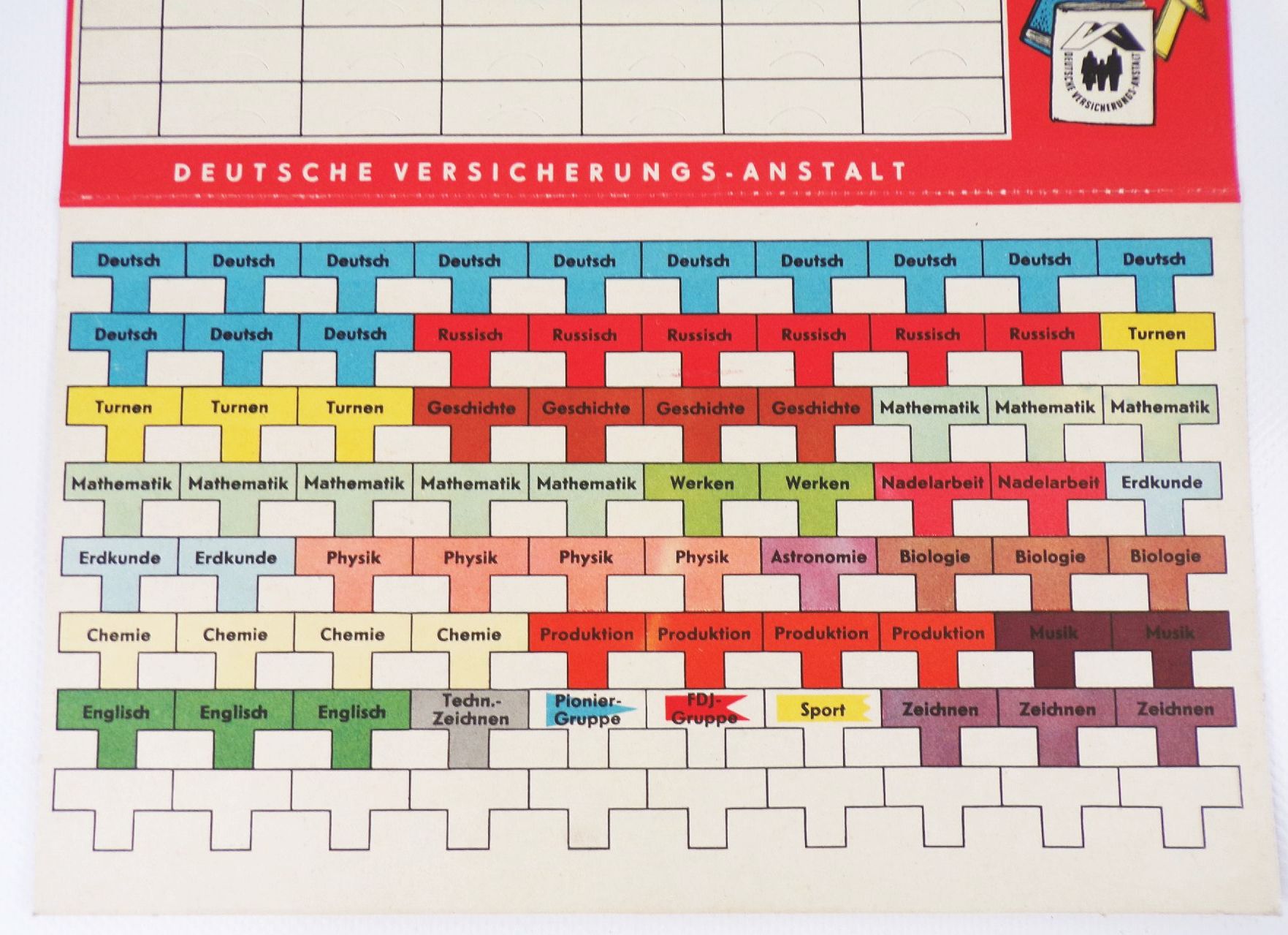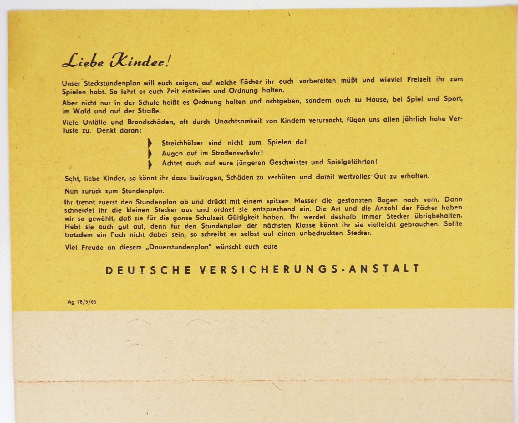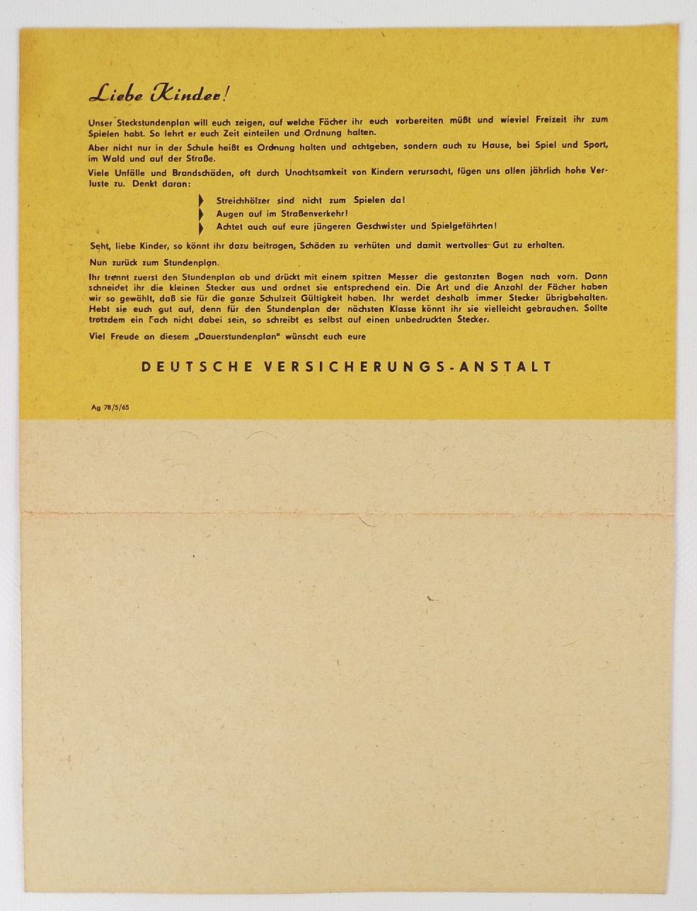 Jeweils 1 originale Schulstundenplan, aus der ehemaligen DDR. Herausgegeben von der Deutschen Versicherungsanstalt, 1965. Unbenutzt, aus stärkeren Papier. Blattmaße: 20,5 x 27,5 cm. Erhaltung: alt, ansonsten gut, alles weitere siehe bitte Fotos.