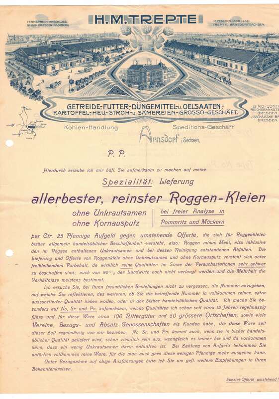 Trepte Getreide Futter Düngemittel Arnsdorf Sachsen Litho Briefkopf 1910er