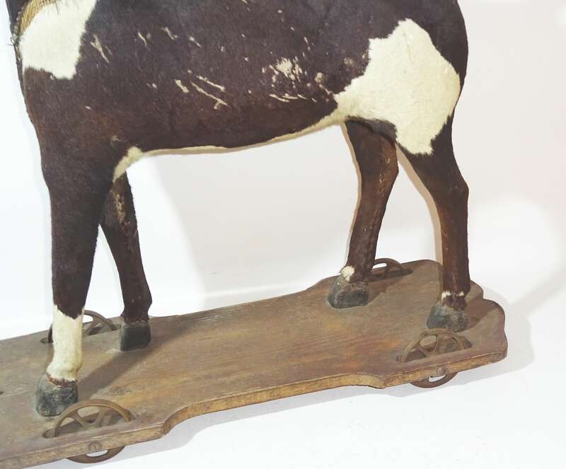 Uraltes Spielzeugpferd Gussräder Echtfell Glasaugen um 1890 Schaukelpferd