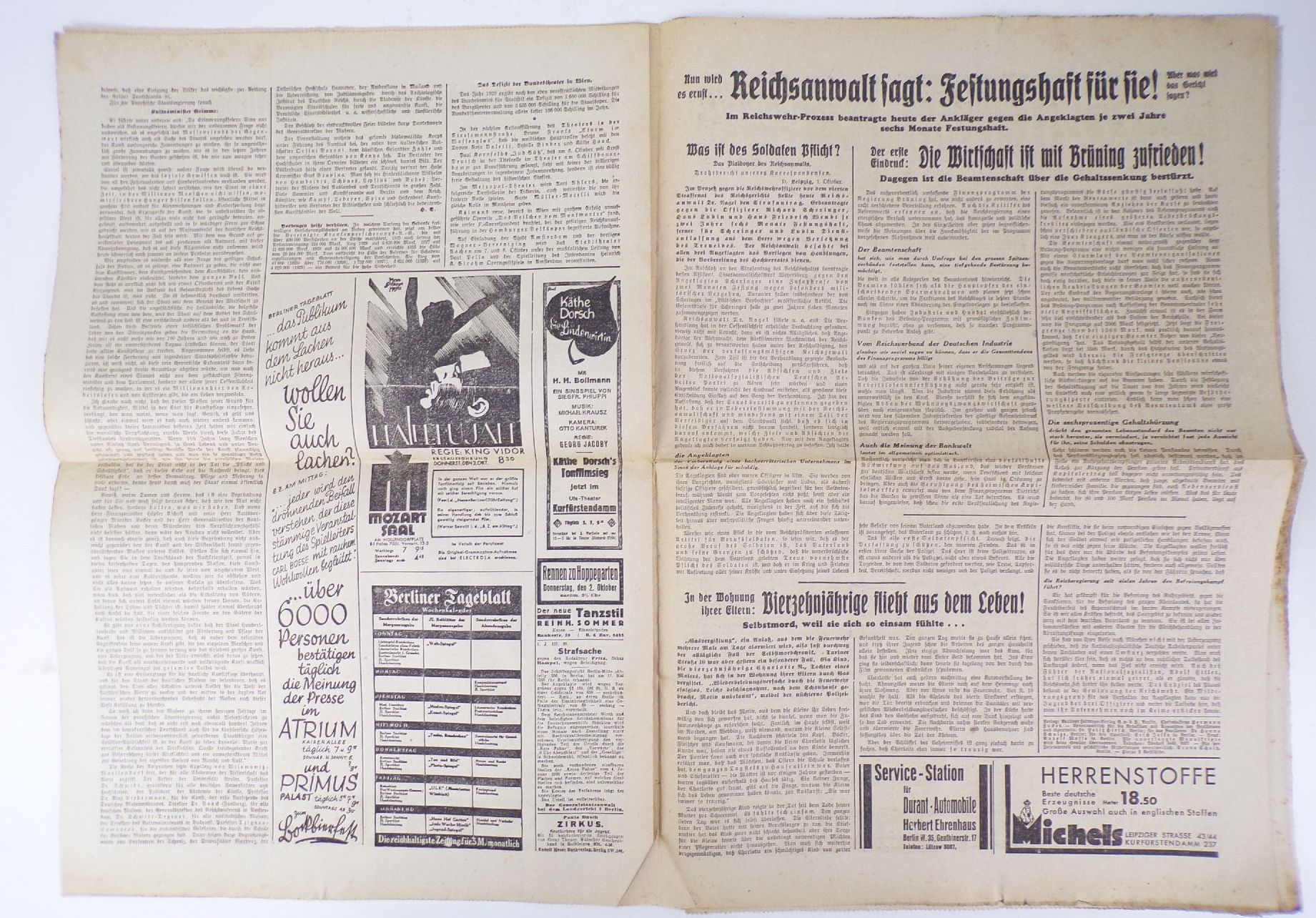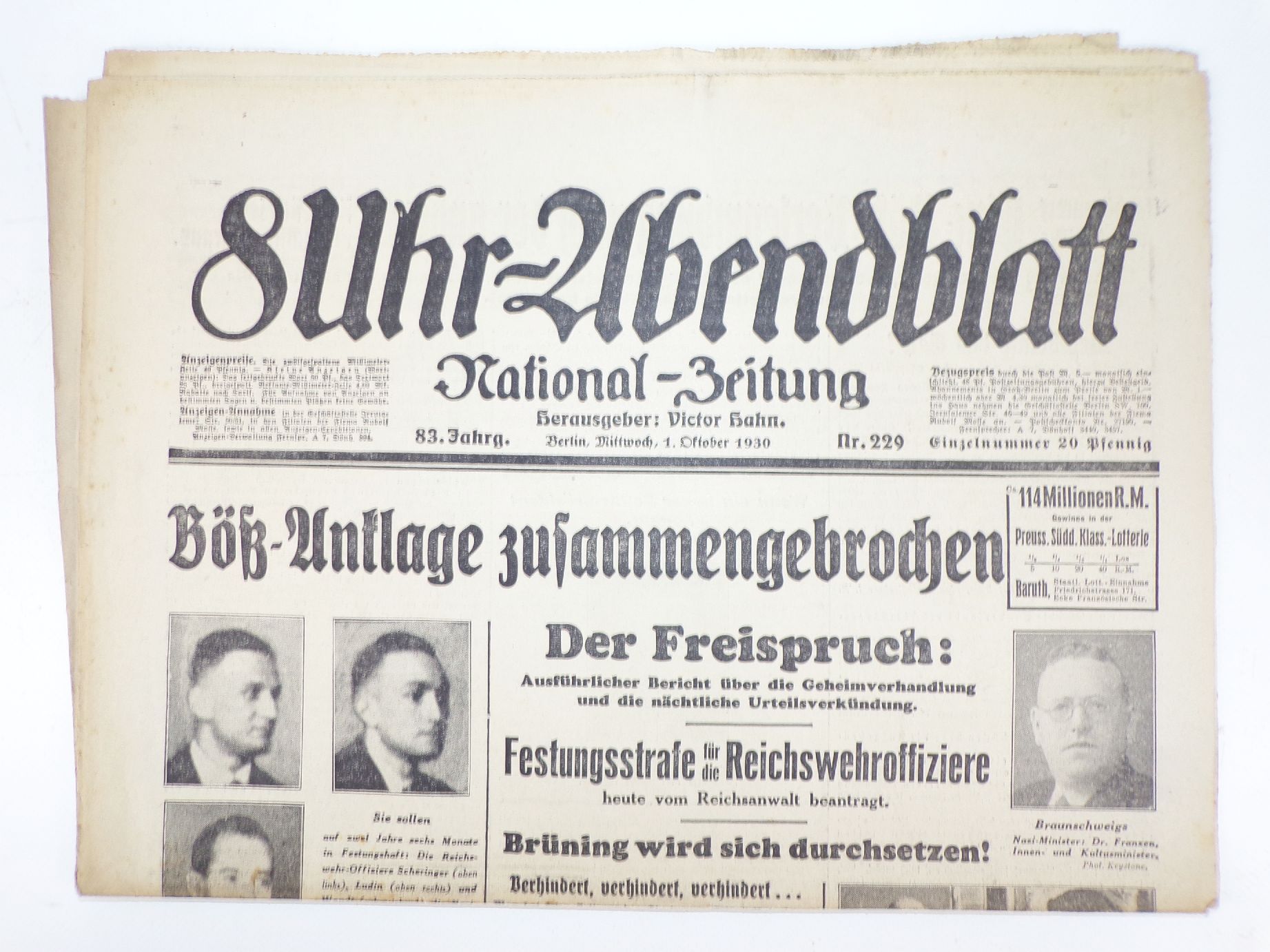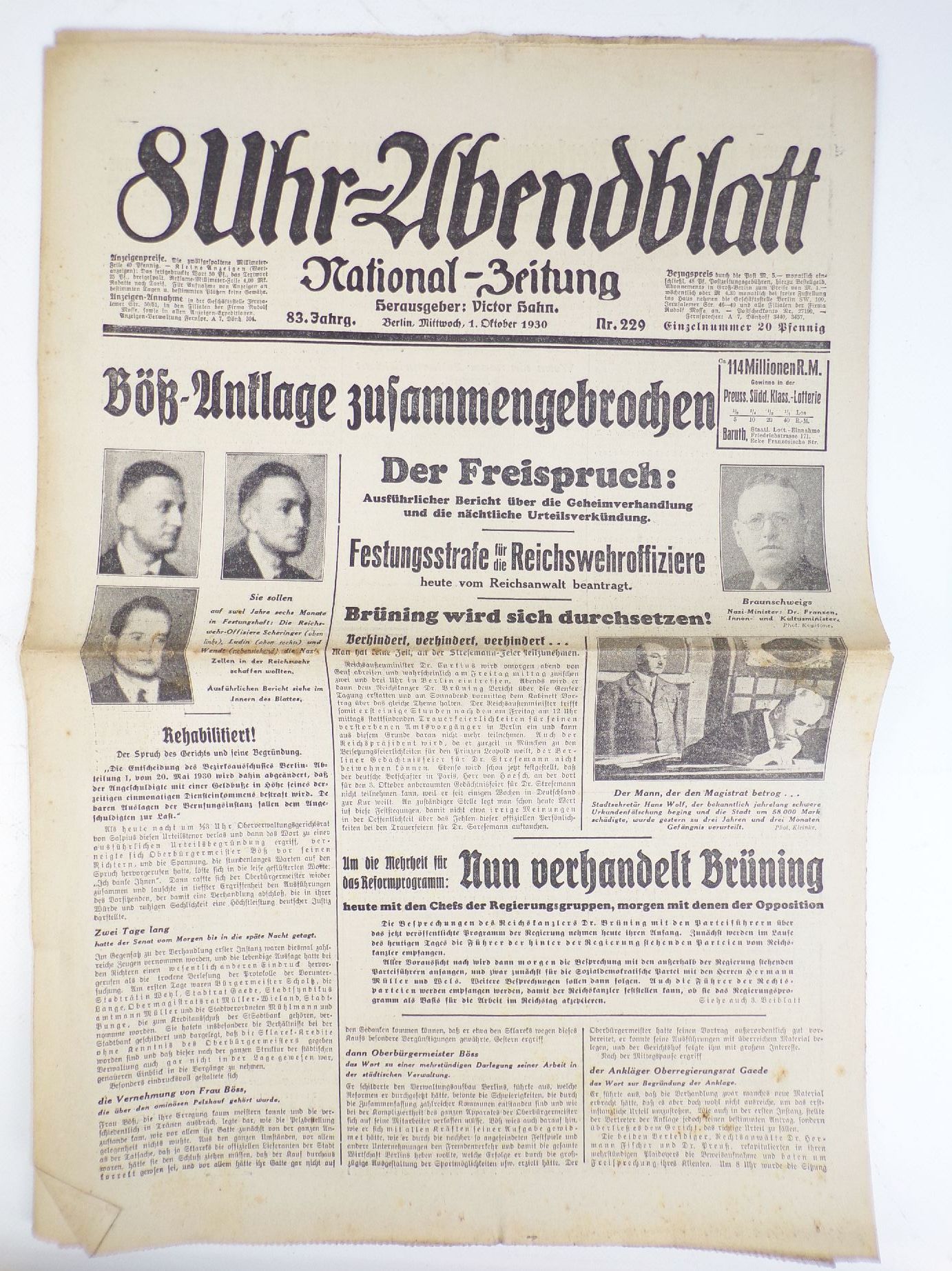 Zeitung 8 Uhr Abendblatt 1930 Nr 229 Böß Anklage Freispruch Festungsstrafe